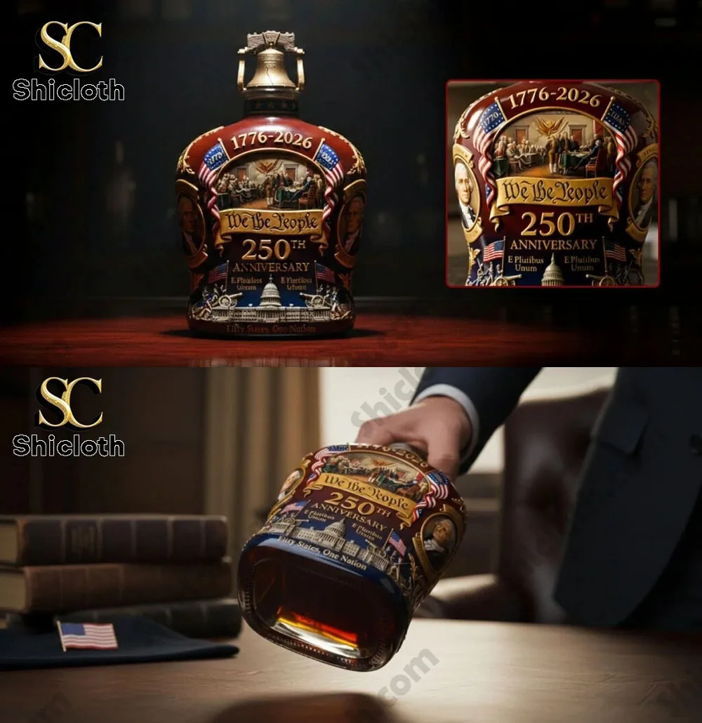 The 250 Years of American Freedom Liberty Bell Crystal Whiskey Bottle is a vibrant tribute to the American spirit, blending historical reverence with high-end barware design. This commemorative piece features a rich, amber-colored liquid housed in a custom-shaped decanter that mimics the classic silhouette of premium spirits, complete with an intricate Liberty Bell stopper finished in a weathered gold tone. The bottle is adorned with a detailed wrap-around graphic celebrating the US Sestercentennial, showcasing a central scene of the signing of the Declaration of Independence under the dates 1776-2026. The artwork includes the iconic “We The People” script, the US Capitol building at the base, and portraits of founding figures like George Washington framed in gold medallions on the sides. Small details like the “E Pluribus Unum” motto and the “Fifty States, One Nation” inscription at the bottom edge add layers of depth to its patriotic aesthetic.