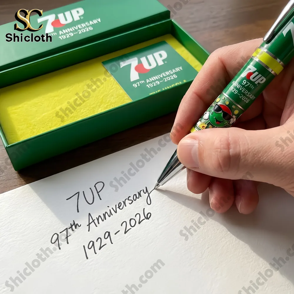 This limited-edition pen features a striking emerald green finish that perfectly mirrors the classic 7UP branding. The barrel is meticulously decorated with the “97th Anniversary 1929–2026” inscription and the vintage Cool Spot mascot wearing sunglasses near the tip, adding a playful yet collectible touch. You will notice the polished alloy clip and tip provide a brilliant silver shine that contrasts beautifully against the green body. Every detail, from the crisp white logo to the yellow accent rings, is positioned to create a balanced, professional look that stands out in any office or study setting.