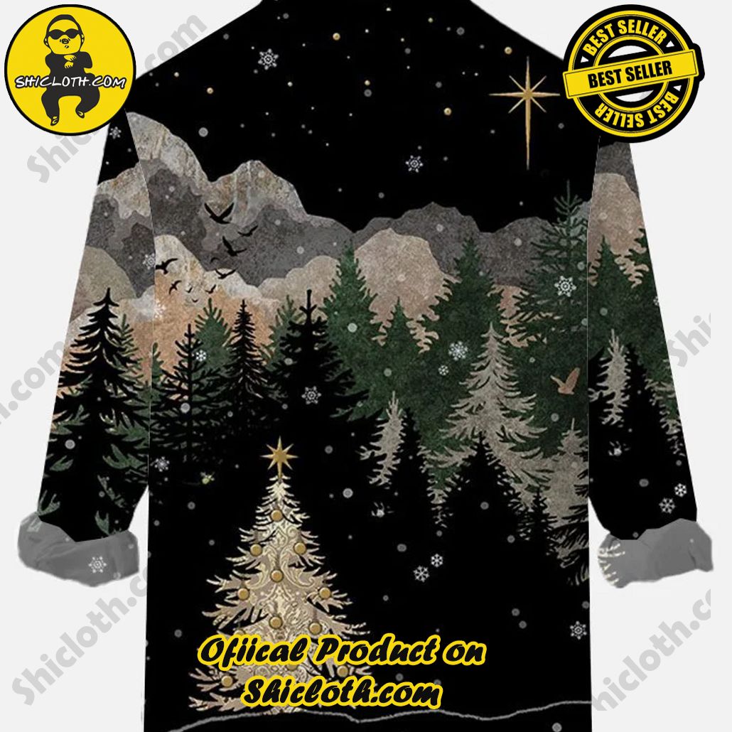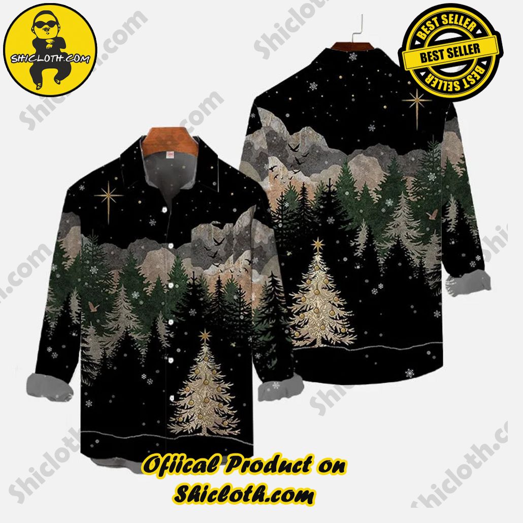 Product Information : Abstract Black Starry Night Lush Forest And Golden Christmas Tree Printing Breast Pocket Long Sleeve Shirt