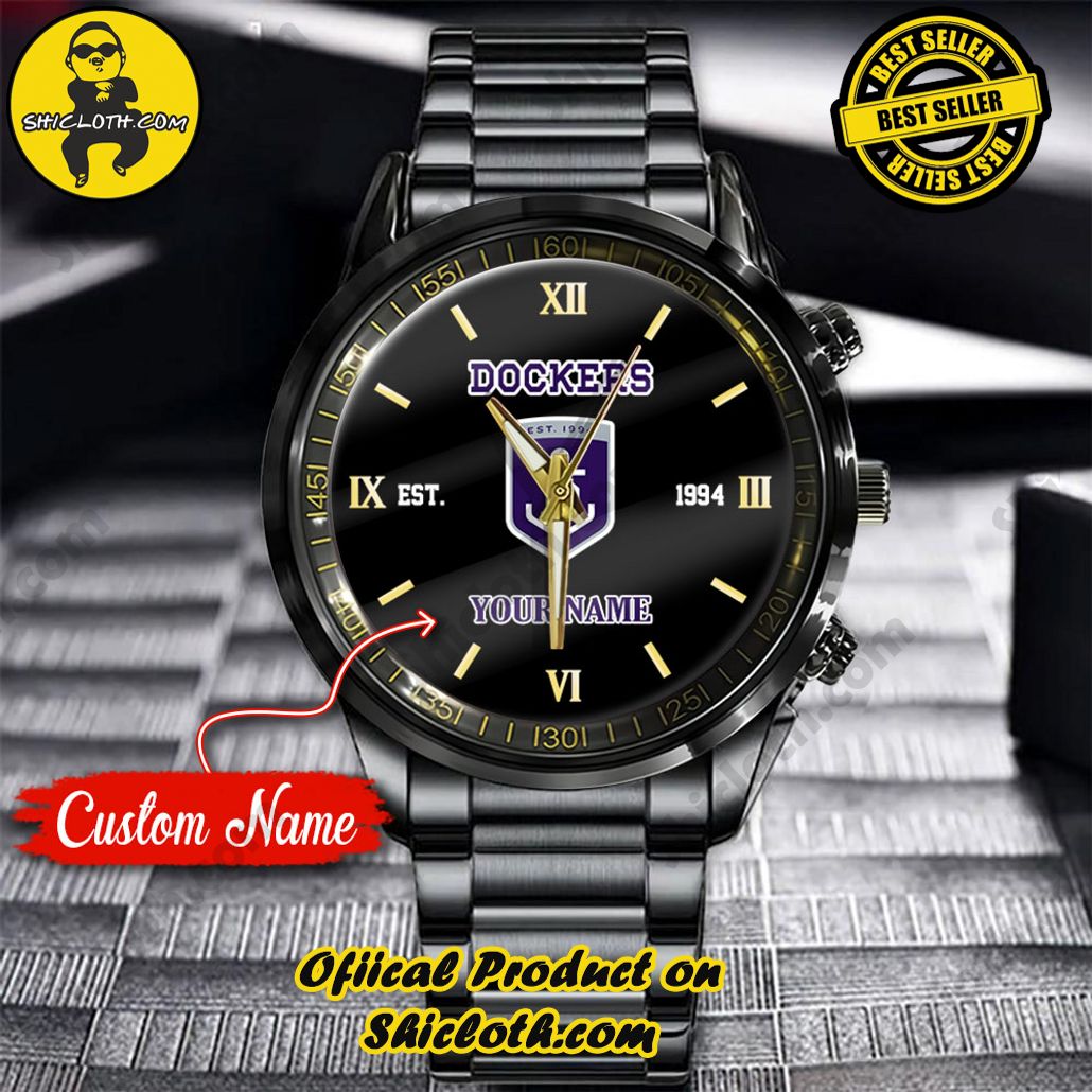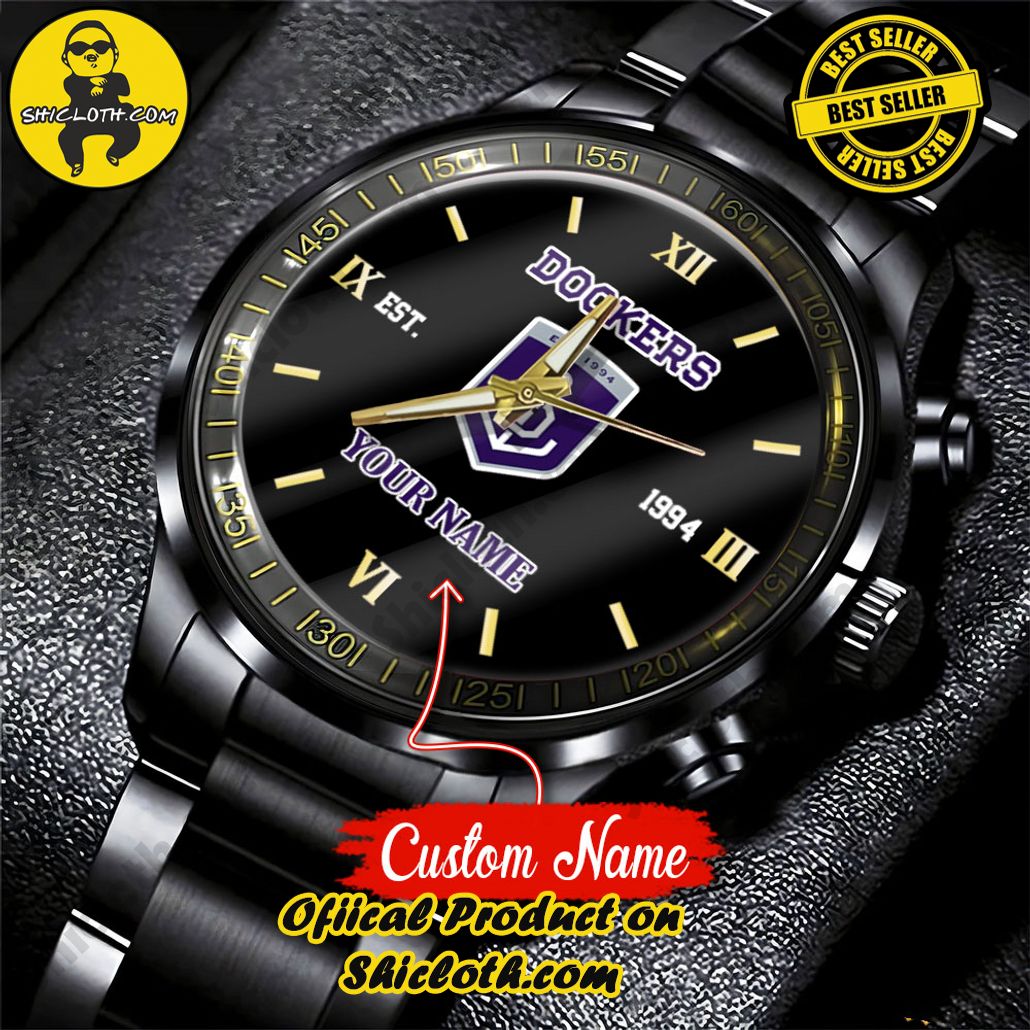 Introducing the extraordinary AFL Fremantle Dockers Custom Name Stainless Steel Watch – a timepiece that embodies the true spirit of the faithful. This watch is meticulously crafted in the USA with surgical-grade stainless steel, ensuring exceptional durability and resistance to everyday wear and tear. The sleek and stylish design features a vibrant Fremantle Dockers logo, a customizable name engraving, and a scratch-resistant mineral crystal that protects the precision quartz movement. Whether you’re cheering on your team at the stadium or navigating the daily grind, this watch will be a constant reminder of your unwavering support for the purple army. With its adjustable buckle clasp and worldwide shipping, you can proudly wear your passion for the Fremantle Dockers wherever you go. Elevate your game-day experience or gift the perfect keepsake to a fellow fan today!