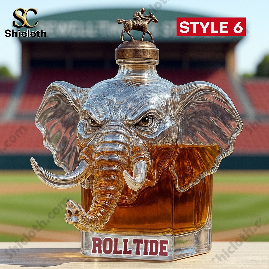 This collection offers incredible variety to match your favorite pour. The flagship design features a bold, translucent red glass “A” logo with a stunning 3D silver elephant emerging from the center. You can customize your look based on the bottle stopper: Style 1 features the iconic gold Crown Royal crown, Style 2 uses a sleek black Jack Daniel’s cap, Style 3 sports the classic Blanton’s horse and jockey, and Style 4 is finished with the signature red Maker’s Mark wax dip. There is even Style 7, which is a full elephant-head shaped bottle with “Roll Tide” etched across the base.