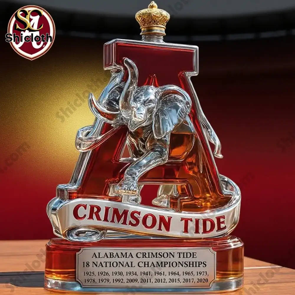 Get ready to show off your team spirit in the most epic way. This is not just a bottle; it is a stunning collector’s piece for any Alabama Crimson Tide fan. We are talking about a gorgeous glass decanter shaped like the iconic “A” logo, complete with a detailed elephant mascot sculpture inside. This specific bottle highlights the fan-favorite Crown Royal style stopper, a detailed gold-colored crown. We also offer other styles to match any bar collection, including the black stopper (Jack Daniel’s style), the red wax-dipped stopper (Maker’s Mark style), the horse and rider stopper (Blanton’s style), and the green stopper (Jameson style).