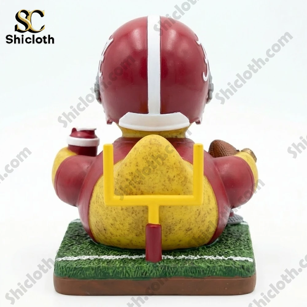 This collectible is packed with intricate details that any Bama fan will appreciate. The duck is dressed in a classic crimson jersey featuring the number 18 and “ALABAMA” text across the chest, paired with a realistic football helmet complete with the “A” logo and a protective facemask. In its “wings,” it holds a textured football and a crimson shaker cup, while a large championship ring sits prominently on its right hand. The base is crafted to look like a lush green football field, featuring a white yard line, a yellow goalpost in the back, and a “Roll Tide” plaque at the front. Even the legendary houndstooth pattern is represented on a small hat resting on the turf, making it a complete storytelling piece.