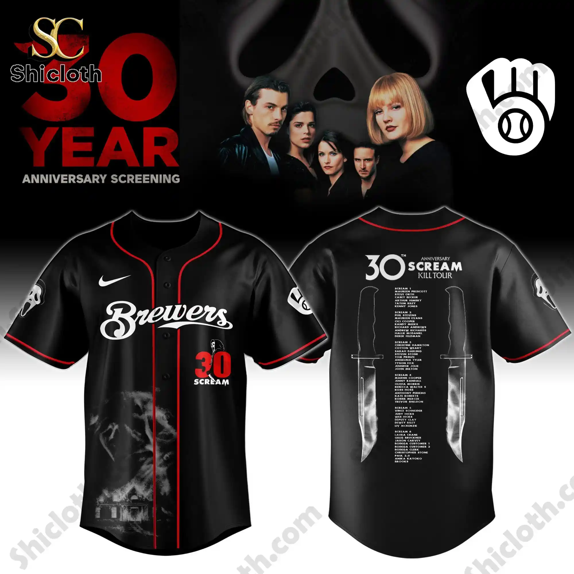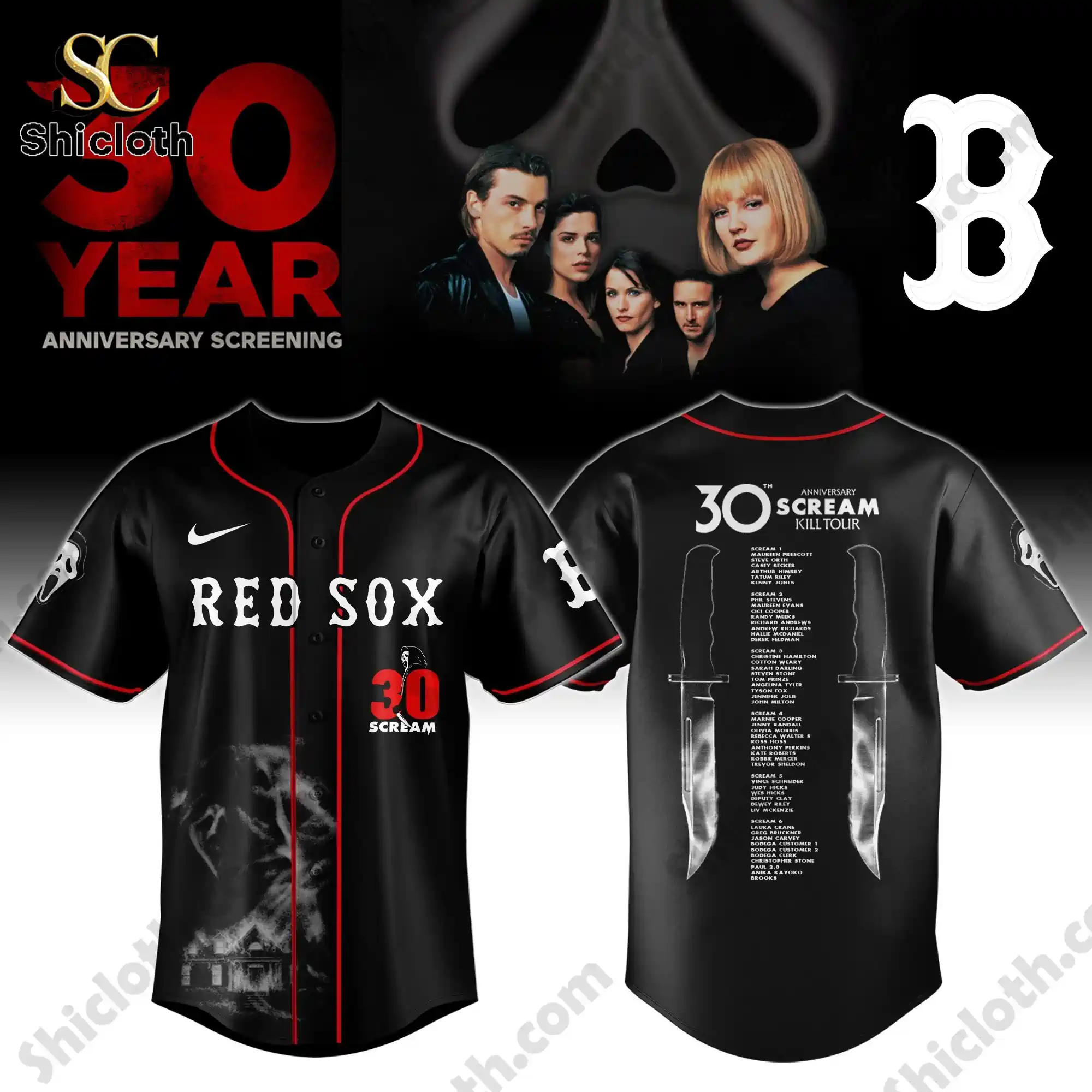 This jersey is a masterpiece for horror fans, featuring a full button-down closure that maintains a traditional athletic look. The front showcases a large Ghostface silhouette over a burning house graphic, paired with the team name in stylized font and a bold red “30 Scream” anniversary badge. On the back, you will find a detailed Scream Kill Tour list framed by two large hunting knives, cataloging names from the entire franchise history. The sleeves are also adorned with the Ghostface mask and team sub-logos, ensuring that every angle of the garment tells a story.