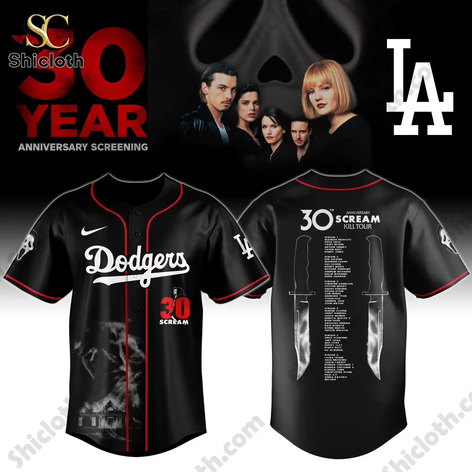 The MLB x Scream Kill Tour 30 Year Memory Jersey is a striking mashup of classic baseball aesthetics and 90s slasher nostalgia. These jerseys feature a sleek black base with vibrant red piping, blending iconic team logos like the Dodgers, Yankees, Brewers, and Red Sox with a haunting Ghostface motif and a comprehensive “Kill Tour” list on the back.