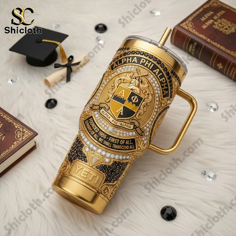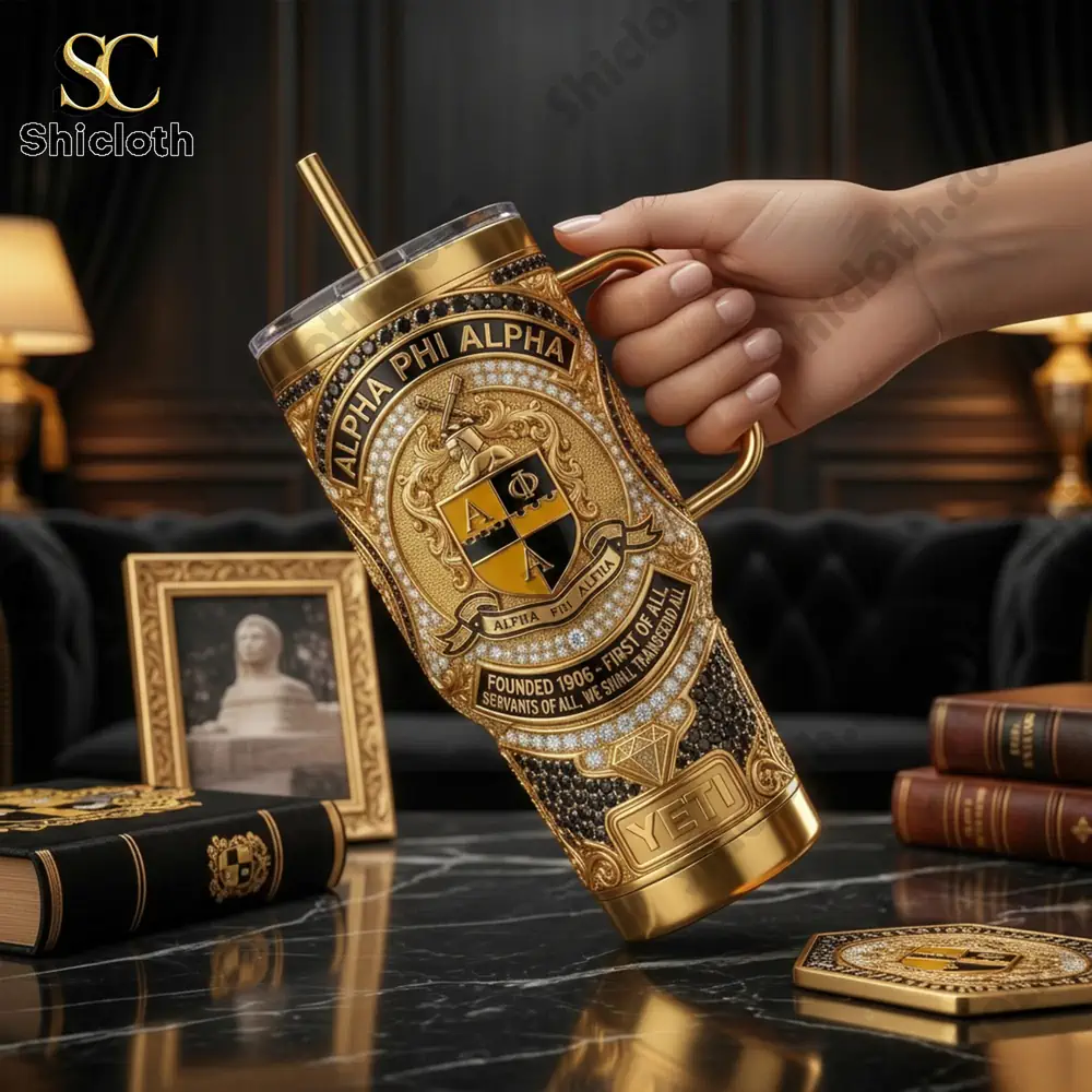 The Alpha Phi Alpha Fraternity, Inc. 2026 YETI Tumbler is a masterful blend of luxury and utility, designed specifically for brothers who value prestige and high performance. This set features a stunning gold-plated finish adorned with intricate black and gold crests, shimmering diamond-like accents, and the iconic fraternity motto. Whether you are attending a formal Greek gala or enjoying a weekend getaway, this tumbler serves as a bold statement of brotherhood and excellence.