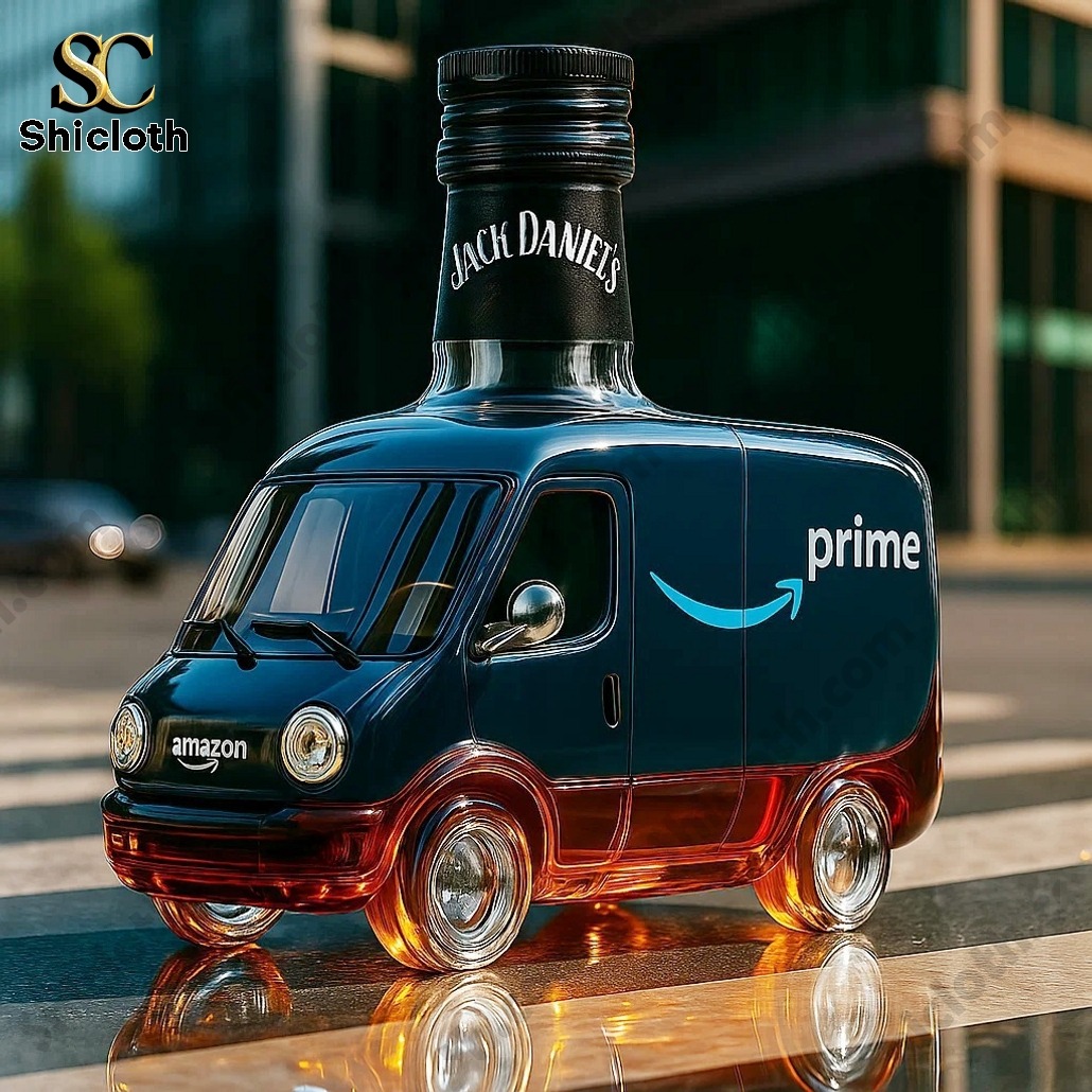 These decanters feature a meticulously detailed Amazon delivery van body, crafted from high-quality glass with a sleek navy blue finish and the unmistakable white Prime logo. The bottom half of the van is transparent, allowing the rich amber hue of your whiskey to glow through the “chassis.” You can choose from several iconic closures to match your taste: the Crown Royal version features a regal purple and gold crown, the Jack Daniel’s style has a rugged black textured neck, the Maker’s Mark option is finished with a signature red wax-dip look, the Blanton’s topper showcases a bronze horse and jockey, and the Jameson version sports a classic green Irish whiskey cap.