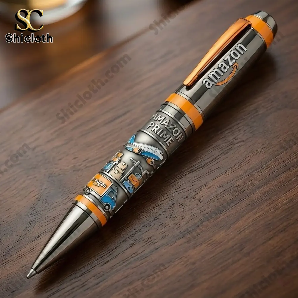 This collector’s item stands out with its intricate 3D embossed motifs on the barrel, showcasing Amazon’s logistics milestones including delivery vans, cargo planes, and packages. The body is crafted from high-quality stainless steel, providing a balanced weight that prevents hand fatigue during long writing sessions. You will notice the classic Amazon logo positioned prominently on the cap, while the words “Amazon Prime” are etched into a central metallic ring. The accents, including the clip and the conical tip, are made of polished alloy to resist oxidation and maintain a high-gloss finish over time.