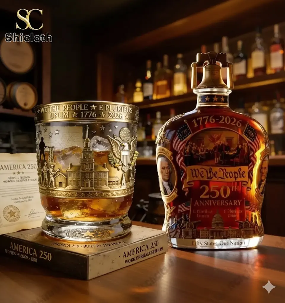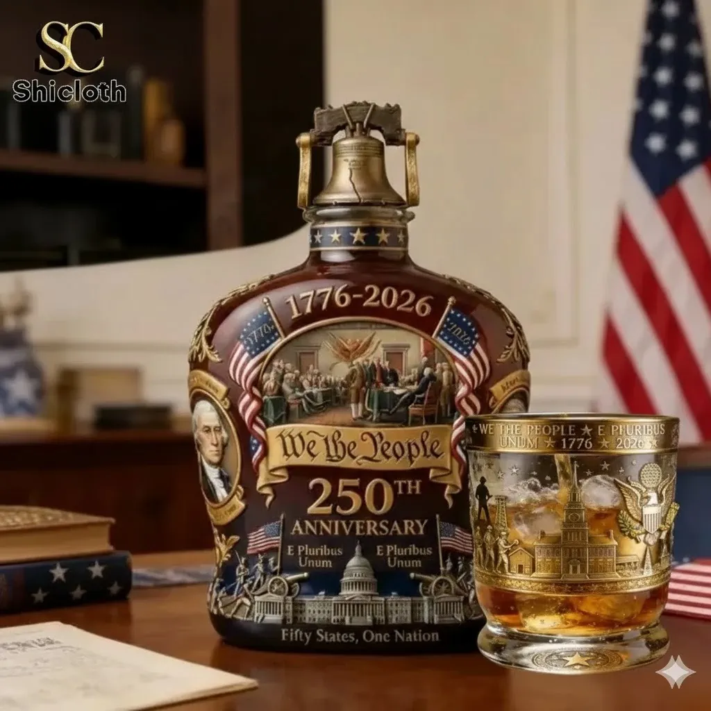 Essential Information America We The People 250th Anniversary Whiskey Glass And Bottle