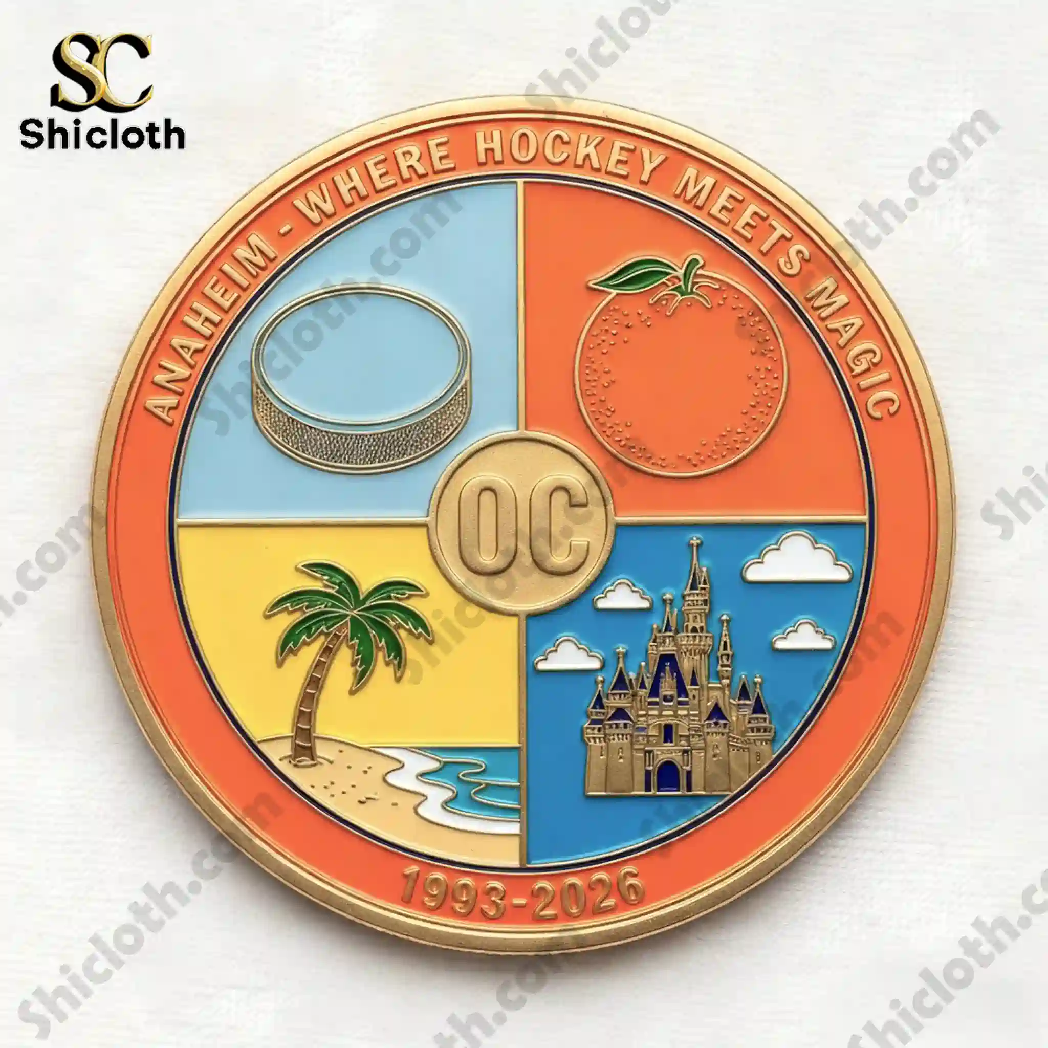 This coin features a brilliant orange enamel border that frames a detailed landscape of Anaheim, including the famous Sleeping Beauty Castle and the city skyline. At the center sits the legendary Mighty Ducks goalie mask logo in white and black, layered over crossed hockey sticks. The bottom of the front face is adorned with delicate orange blossoms and crashing blue waves, accompanied by the inspiring text “Born of Ice & Sun.” On the reverse, the design is split into four distinct quadrants representing a hockey puck, a local orange, a palm tree on a beach, and the iconic castle, all surrounding a central “OC” gold-tone medallion.