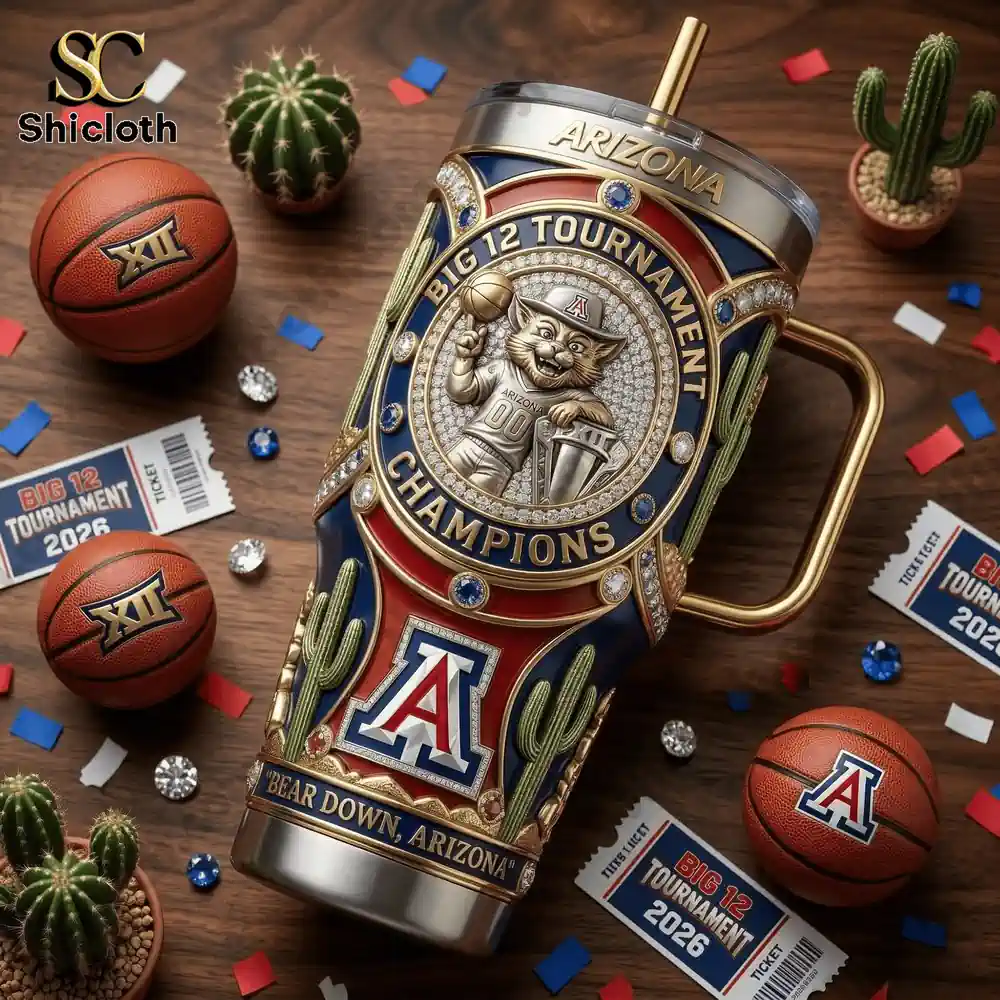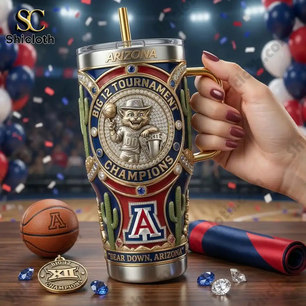 The tumbler features an exquisite design that stands out from typical fan gear. Central to its design is a 3D embossed graphic celebrating Arizona Wildcats, complete with text like “Big 12 Tournament Champions 2026”. The detailed artistry includes Arizona’s desert landscape with saguaro cacti, the primary “A” logo with embedded blue crystal accents, and a distinctive cowboy mascot graphic holding a championship trophy and a basketball. This high-quality construction is made from durable, double-wall stainless steel for excellent vacuum insulation, ensuring your drinks stay ice-cold for 24+ hours or hot for 12+ hours. The exterior is adorned with sparkling embedded crystal elements and features a convenient integrated gold handle and reusable gold-colored straw for easy sipping and carrying. With a substantial 40oz capacity, it’s built for both rugged use and a polished appearance, so you can enjoy your beverages with ease while showing your Wildcats spirit.
