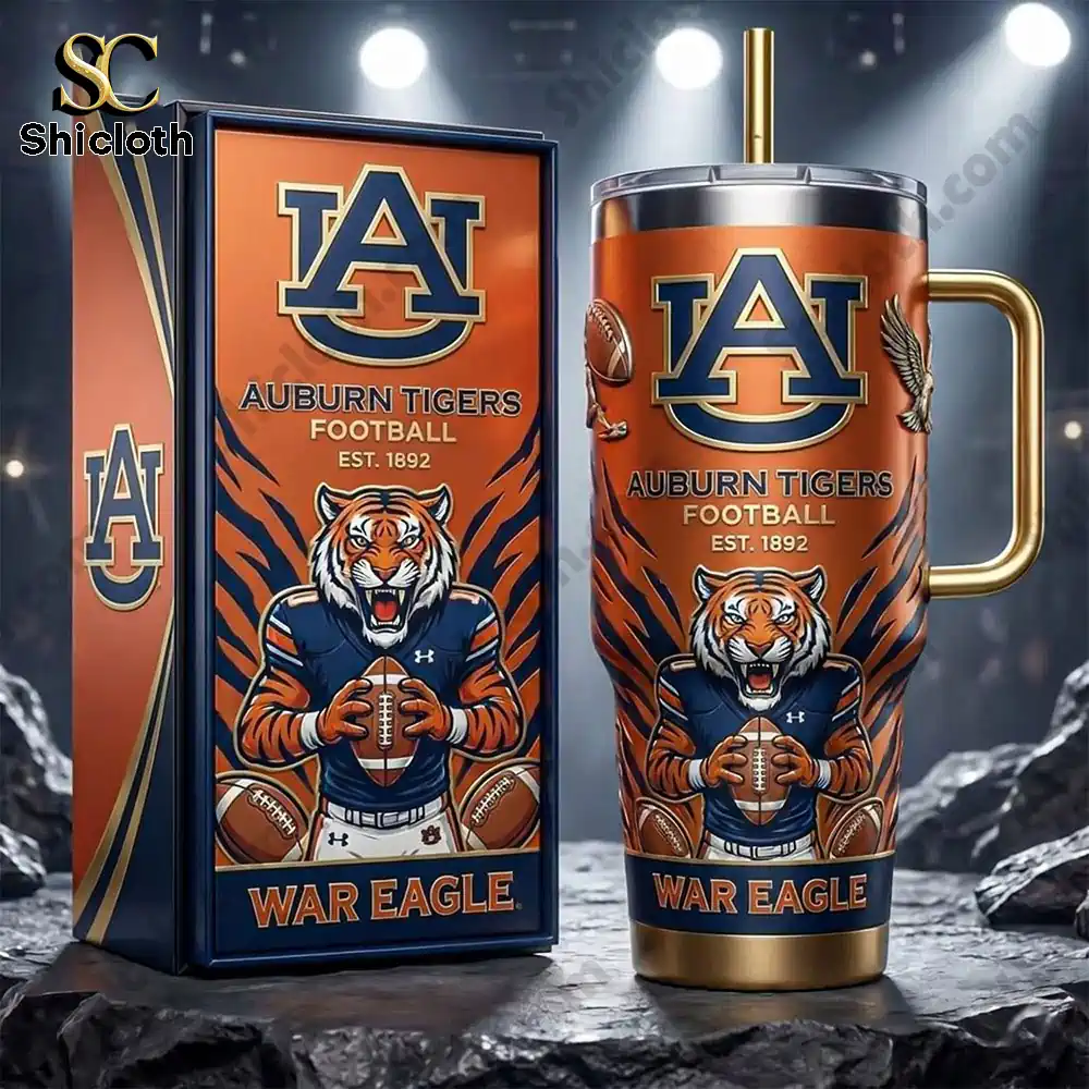 The Auburn Tigers War Eagle 40Oz Yeti Tumbler is the ultimate gear for fans who want to combine their team pride with high-performance hydration. This heavy-duty tumbler features a vibrant orange and navy blue color scheme, centered around a detailed 3D-effect Auburn logo and a fierce tiger mascot dressed in football gear. The design is meticulously layered, showcasing the “War Eagle” slogan at the base and “Est. 1892” text to honor the program’s long history. Small details like the textured golden handle and matching gold-tone straw add a premium feel, while the background of the tumbler is accented with subtle football and eagle wing motifs.