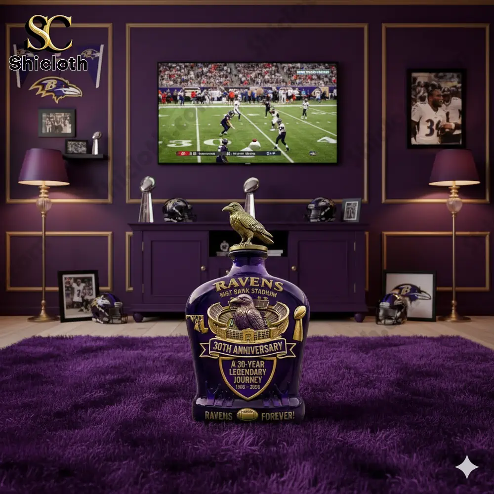 This special decanter is a visual touchdown, featuring a rich purple base color that perfectly captures the Ravens’ spirit. The front is dominated by a detailed, gold-toned emblem showcasing M&T Bank Stadium and a bold raven at its center, all framed by the “RAVENS M&T BANK STADIUM” text at the top. A prominent banner declares the “30TH ANNIVERSARY” with the celebratory timeline “1996 – 2026,” resting above a shield that reads “A 30-YEAR LEGENDARY JOURNEY.” The base of the bottle finishes with a football icon and the rallying cry, “RAVENS FOREVER!” The whole piece is capped with a majestic, metallic raven (the Crown Royal-style stopper is replaced by this special raven), adding an unparalleled level of detail and prestige. At a convenient size of 20*10cm, it’s designed to be displayed proudly.
