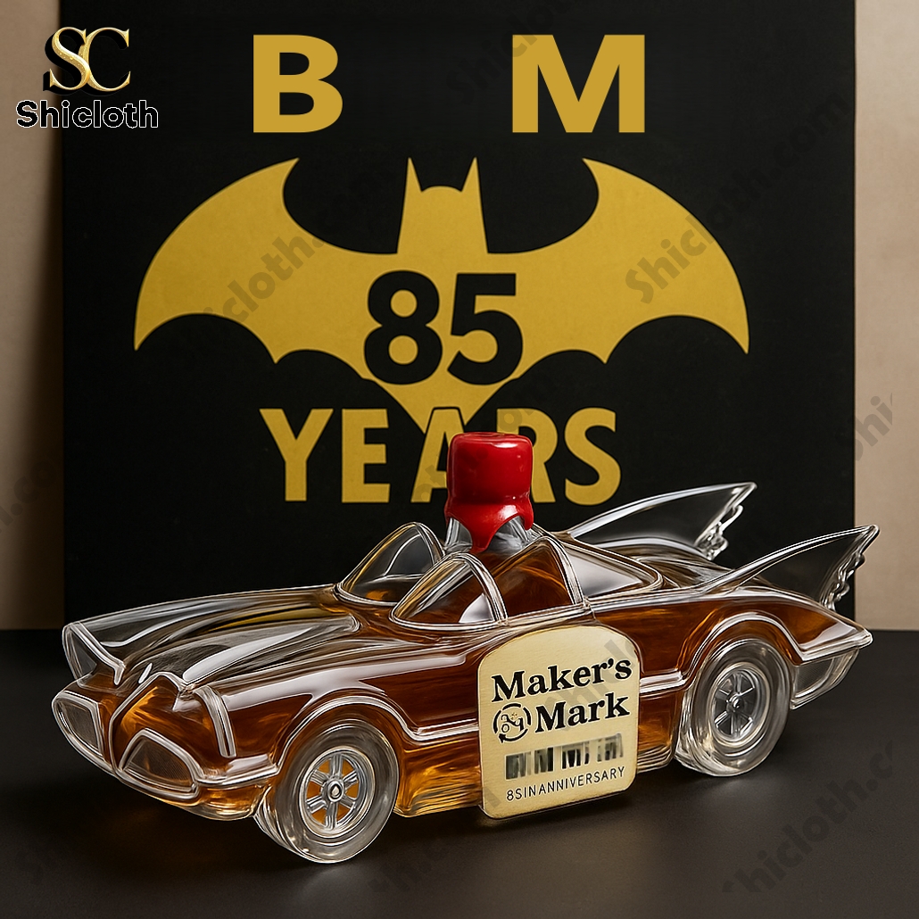 The first design features Jack Daniel’s whiskey inside a bottle shaped like a Batmobile. The glass bottle is shaped with smooth curves and fine detailing that replicates the Batmobile’s iconic form, with subtle touches like the bat-shaped tail fins. The label is neatly placed on the side, highlighting the 85th Anniversary text along with the recognizable Jack Daniel’s logo. The color of the whiskey gives the bottle a rich, amber hue, which contrasts beautifully with the clear glass. The second design uses Crown Royal whiskey, similarly in a Batmobile-shaped bottle but topped with a golden crown. The sleek design still mirrors the original Batmobile, with some added flair thanks to the crown, which represents the premium quality of the whiskey. The third version features Maker’s Mark whiskey in a similar Batmobile shape, distinguished by a red wax seal on top of the bottle. This detail provides a classic and elegant touch, setting it apart while still celebrating the Batmobile’s unique look.