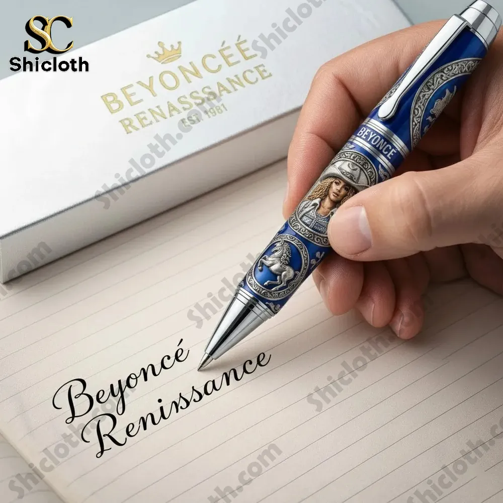The Beyoncé Renaissance Commemorative Pen is a stunning collector’s item designed for fans who appreciate the intersection of music history and fine craftsmanship. This elegant writing instrument features a deep royal blue barrel adorned with intricate silver-toned reliefs, capturing the iconic aesthetic of the Renaissance era.