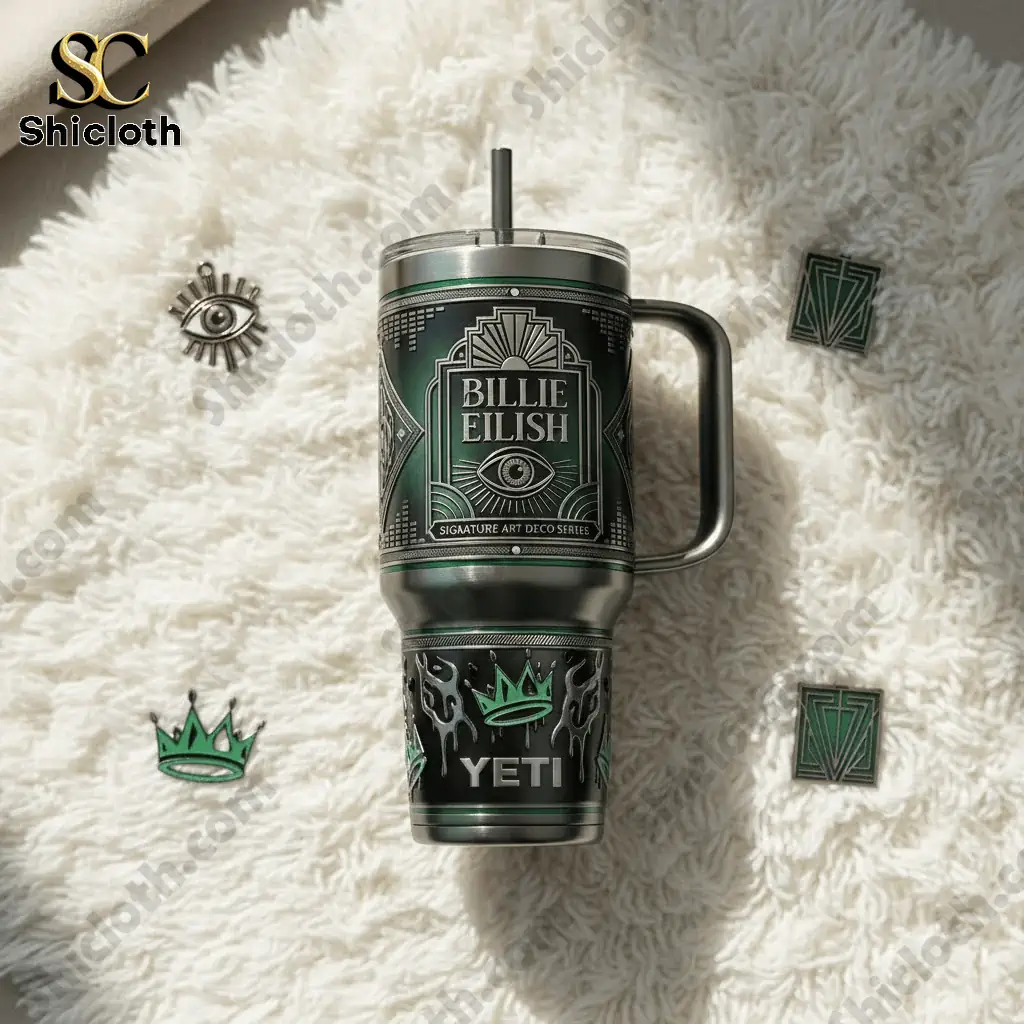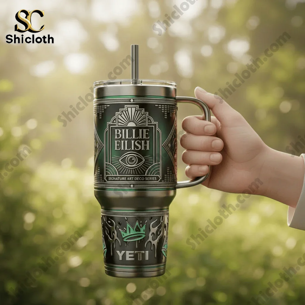 Stay hydrated in style with the Billie Eilish 40Oz Yeti Tumbler With Handle, a premium drinkware piece that blends dark Art Deco aesthetics with top-tier insulation. This tumbler is perfect for fans who want a functional accessory that reflects Billie’s signature vibe, featuring a sleek charcoal and emerald green color palette. Whether you are heading to a music festival, hitting the gym, or just chilling at home, this durable stainless steel cup keeps your drinks at the perfect temperature for hours.