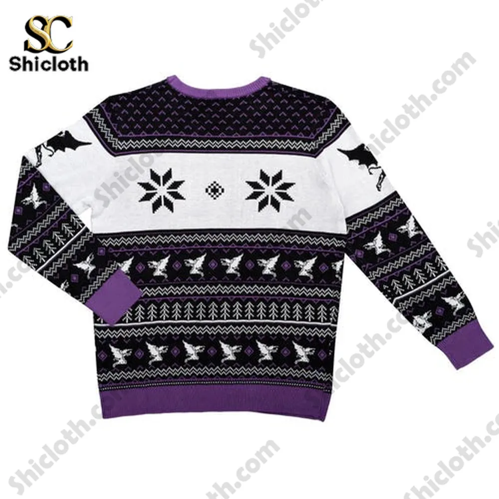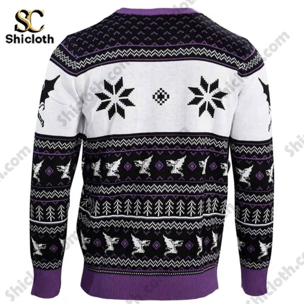 This sweater is a vibrant, intricate design feast, primarily featuring a deep, band-appropriate black base. Across the chest is a large, boldly contrasting white-and-red graphic that cleverly merges classic Black Sabbath iconography—like their distinctive gothic logo—with traditional “ugly sweater” patterns, such as snowflakes and reindeer, only here the reindeer look ready to shred. The design features smaller, intricate motifs woven into the knit, perhaps tiny crosses or bats, scattered down the sleeves and along the hem and collar. The text “Black Sabbath” is prominently displayed, likely front and center, while the specific year or album art might be subtly incorporated into the pattern. The reverse side typically continues the knit pattern with a less busy design, keeping the focus on the main graphic, though a small, vintage tour-style text could be subtly placed near the neckline. This pullover style is designed for maximum visual impact and immediate recognition.