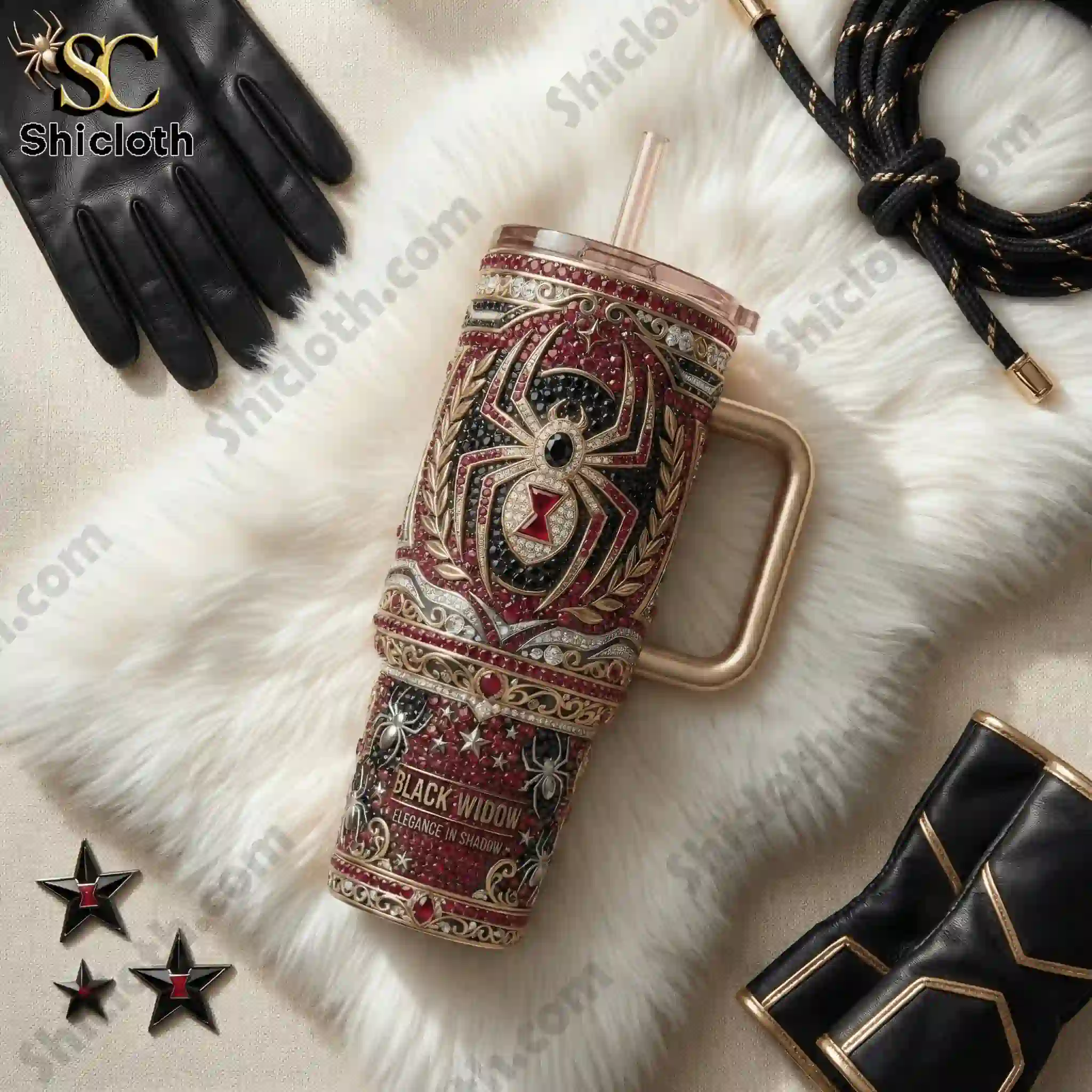 This tumbler features a striking color palette of ruby red and deep black, meticulously adorned with shimmering rhinestones that mimic a complex spider web pattern. The centerpiece is a bold Black Widow spider icon with the signature red hourglass symbol, surrounded by golden laurel-like filigree. Crafted from high-quality inox stainless steel, the body utilizes a double-wall insulated design to maintain drink temperatures regardless of the weather. Small details, such as the sturdy gold-finished handle, the transparent reusable straw, and the elegant “Black Widow” text at the base, provide a polished, regal look. The textures are rich, combining the smoothness of metal with the tactile grip of the crystal embellishments.