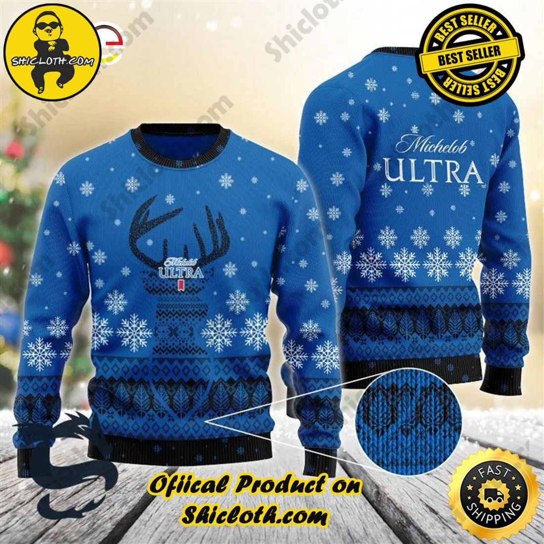 Blue Michelob Ultra Reindeer Snowy Christmas Beer Sweater