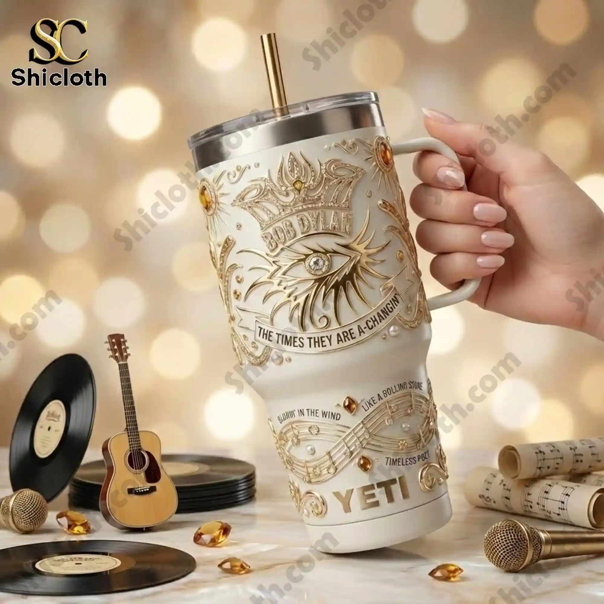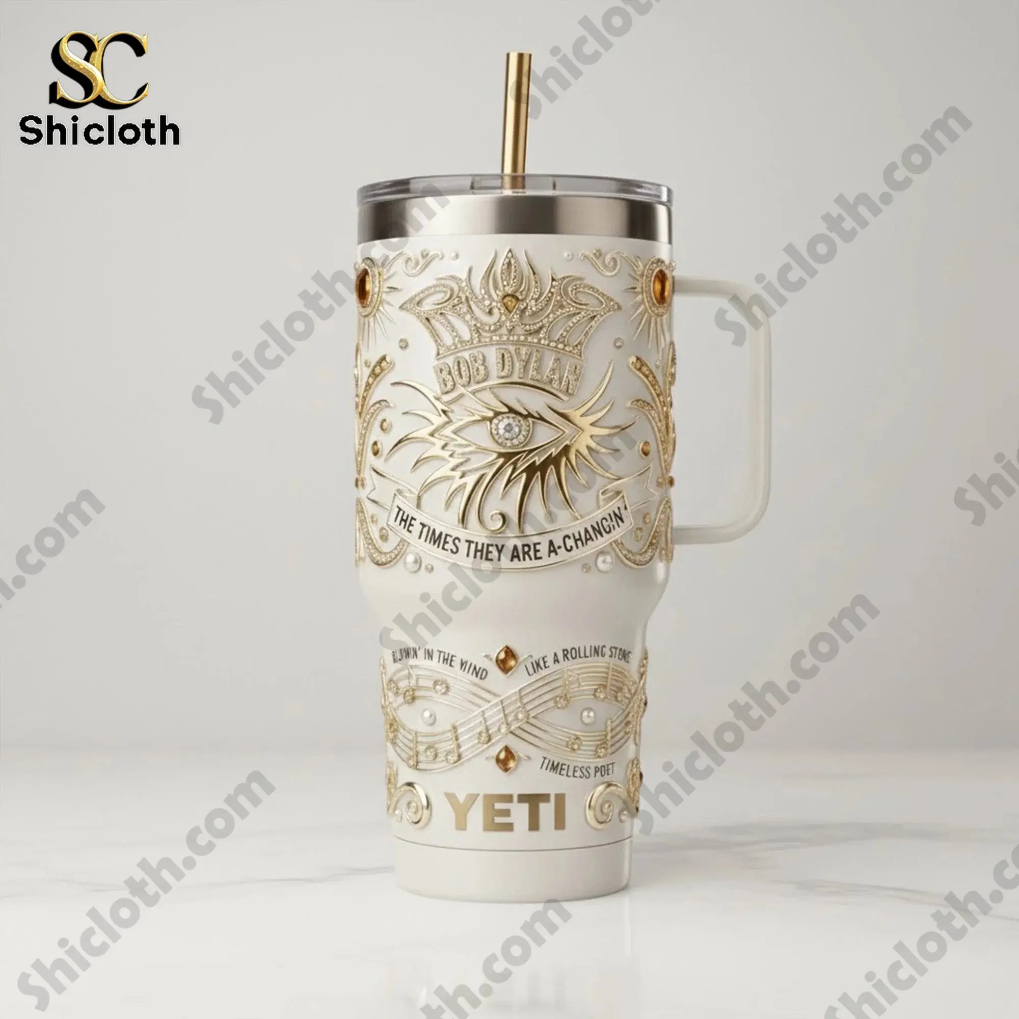 This tumbler stands out with its elegant pearl white finish, adorned with intricate 3D embossed gold motifs that catch the light beautifully. At the center, a majestic eye graphic sits beneath a crown, flanked by the iconic “Bob Dylan” name and “The Times They Are A-Changin” lyrics flowing across a ribbon. The lower section is decorated with graceful golden musical scales and notes, interspersed with tiny gem-like accents for a touch of luxury. Crafted from high-quality inox stainless steel, the tumbler is built for durability and food safety. It features a sturdy ergonomic handle and a 40oz capacity, making it the perfect companion for poolside lounging, boating trips, or daily commutes.