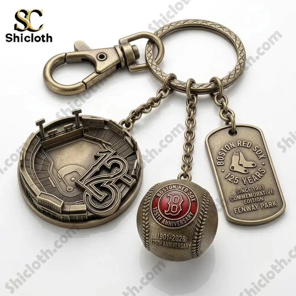 This collector’s keychain is a visual tribute to the team’s legacy, featuring three distinct charms attached to a sturdy, vintage-style bronze ring. The first charm is a detailed 3D miniature of Fenway Park, complete with the iconic light towers and the “125” anniversary logo embossed over the field. Next to it hangs a metallic baseball with a deep red “B” logo at its center, inscribed with “1901-2026” to mark the full century and a quarter of team history. The final piece is a rugged dog-tag charm featuring the classic “hanging socks” logo and the words “Since 1901 Commemorative Edition.” Every element is finished in an antique bronze patina, giving it a timeless, high-end feel that looks great on any set of keys or backpack.