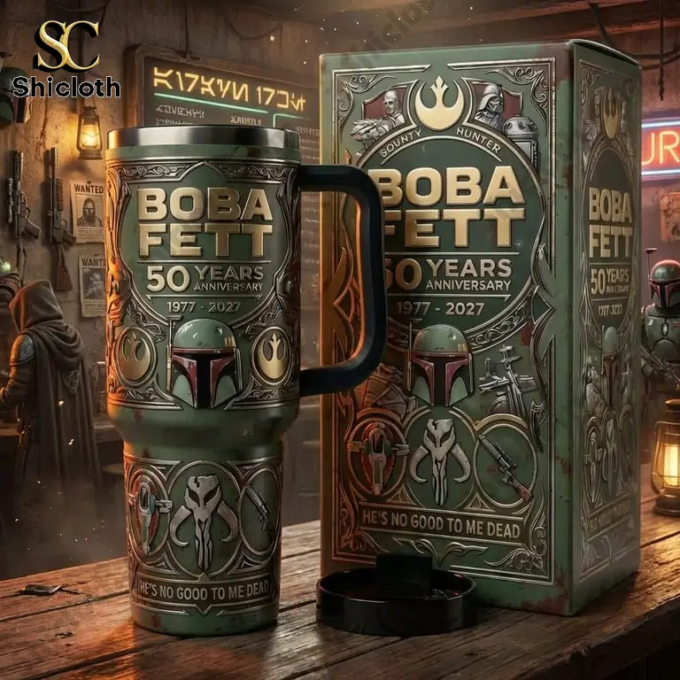 This Bounty Hunter “He’s No Good To Me Dead” Tumbler is the ultimate tribute for fans celebrating 50 years of the galaxy’s most iconic mercenary. Featuring a rugged, weathered green finish that mimics battle-worn Mandalorian armor, this tumbler is packed with intricate details like the Boba Fett helmet, the Mythosaur skull, and the classic “1977-2027” anniversary dates. Whether you are a dedicated collector or just need a reliable way to keep your drinks icy cold, this gear is designed to handle any mission.