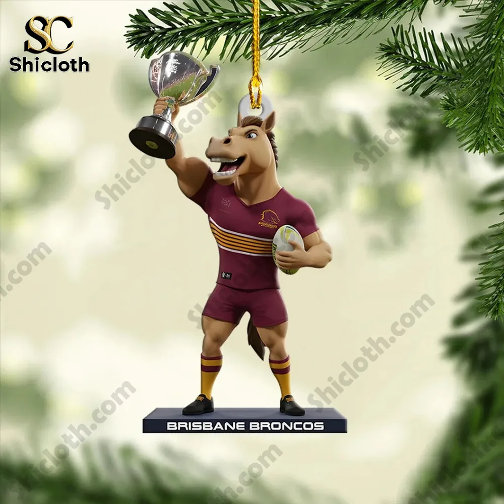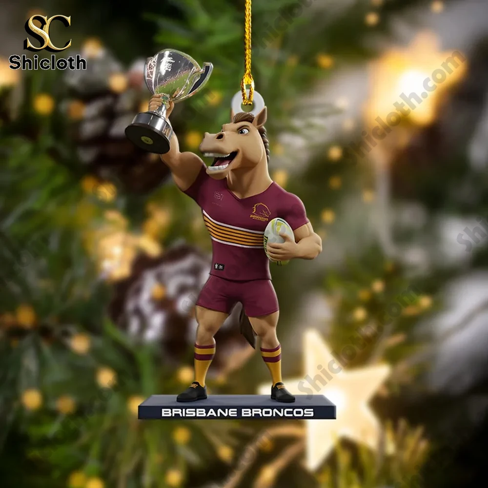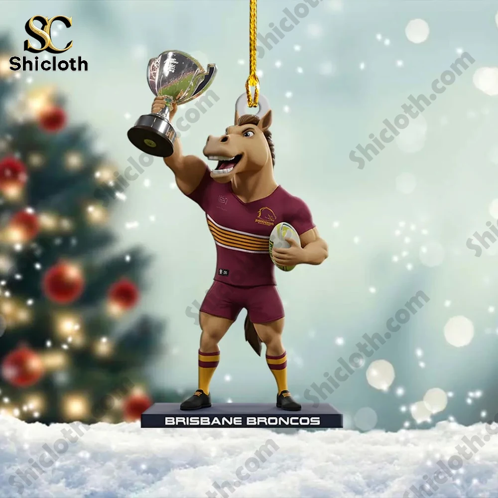 This ornament depicts the Brisbane Broncos mascot, Buck the Bronco, in his maroon and gold playing kit, triumphantly hoisting the premiership cup high above his head while clutching a rugby ball in his other hand. The colors are bright and vivid, thanks to the single-sided, high-resolution UV printing used on the product. Every tiny detail is sharp, from the club logo on his jersey to the laces on the ball. The figure stands on a base that clearly reads “BRISBANE BRONCOS”. It’s crafted from top-tier acrylic material which gives it a substantial, high-end feel, especially with its generous 1.5cm thickness. It comes ready to hang with a gold string, making it easy to display on a tree, in your car, or anywhere else you want to show your support.