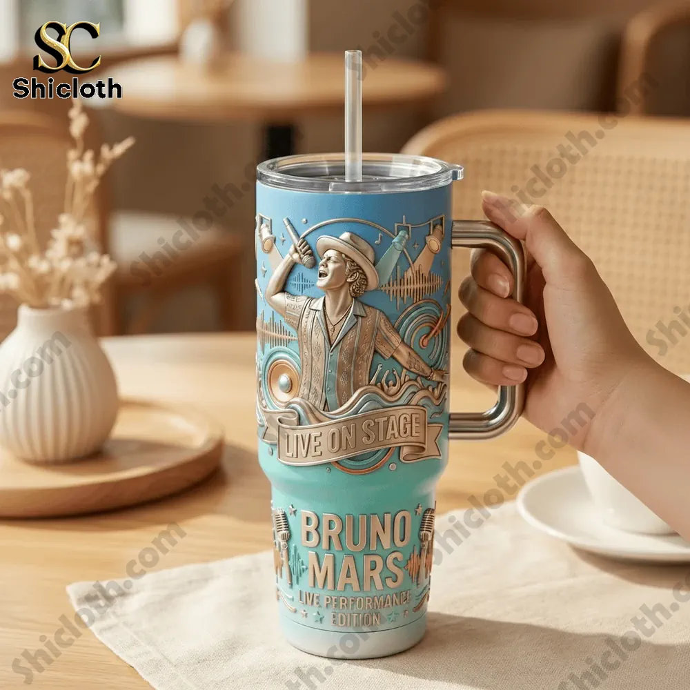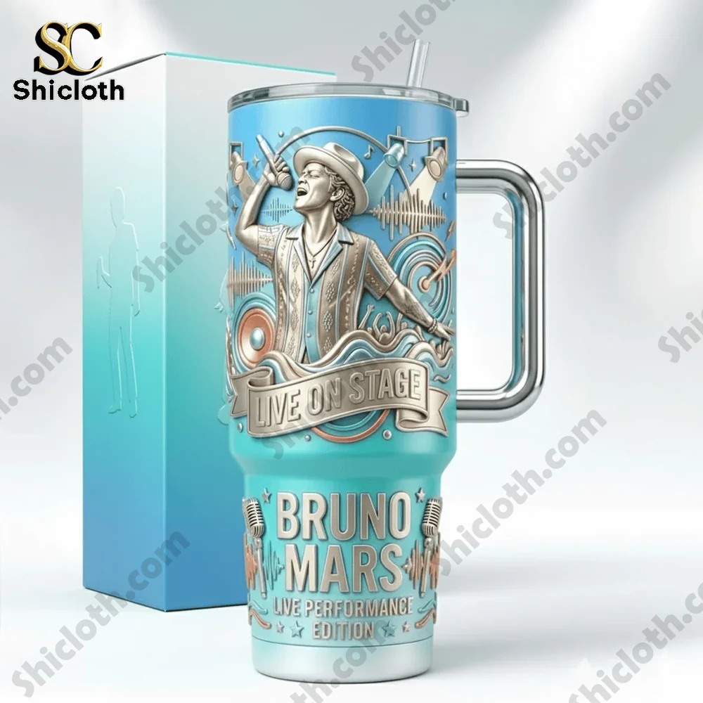 If you are a fan of 24K Magic, this Bruno Mars Live Performance Edition tumbler is the ultimate way to stay hydrated while showing off your love for the superstar. This vibrant sky blue to teal gradient tumbler features a stunning 3D-embossed design of Bruno Mars performing mid-song, complete with his signature fedora and soulful expression. The intricate artwork is layered with “Live On Stage” banners, retro speakers, and musical soundwaves that wrap around the body. At the base, the words “Bruno Mars Live Performance Edition” are prominently displayed alongside vintage-style microphone icons and decorative stars, making the entire piece look like a premium piece of concert merchandise.