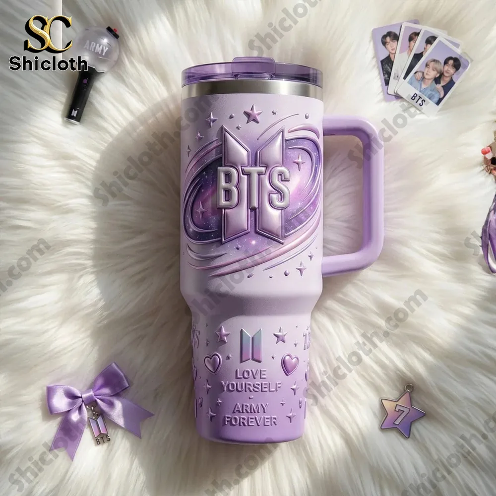 This BTS Love Yourself Army Forever Tumbler is the ultimate accessory for any fan looking to combine their love for the group with a practical, high-quality drinkware item. Featuring a stunning lavender-purple aesthetic, the tumbler showcases a 3D-effect BTS logo surrounded by a cosmic galaxy swirl and delicate stars. The lower section is embossed with the meaningful “Love Yourself” and “Army Forever” mottos, accented by small hearts and the iconic “7” symbol.