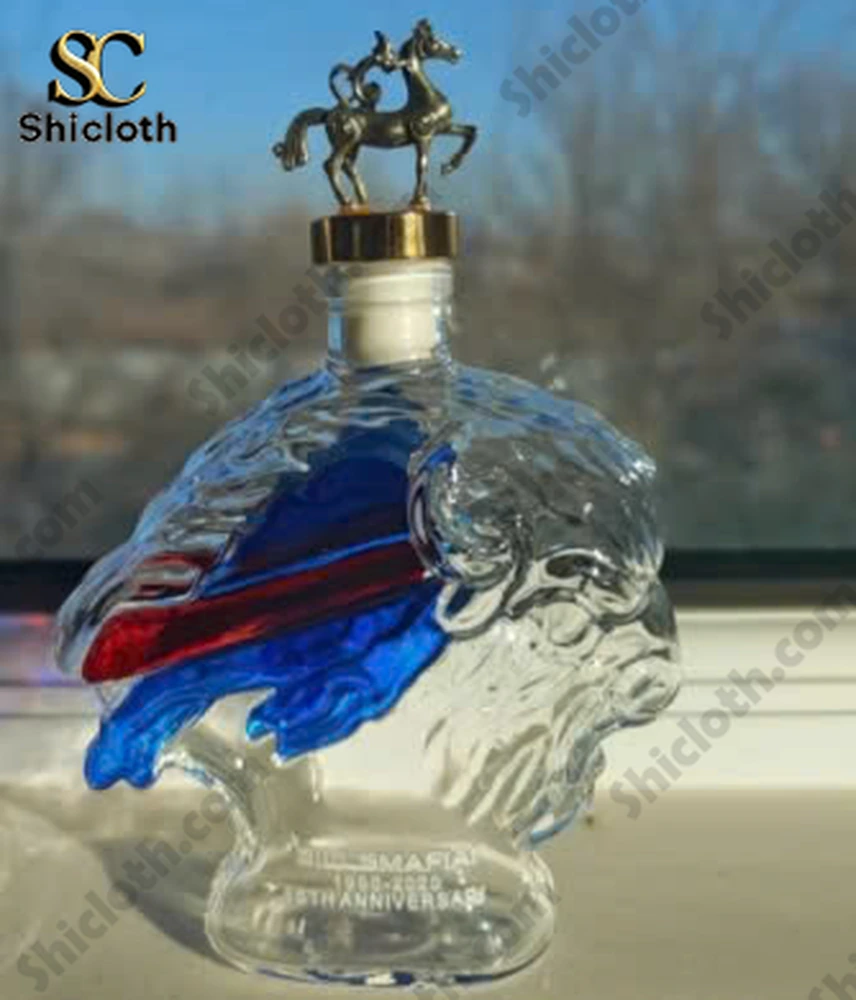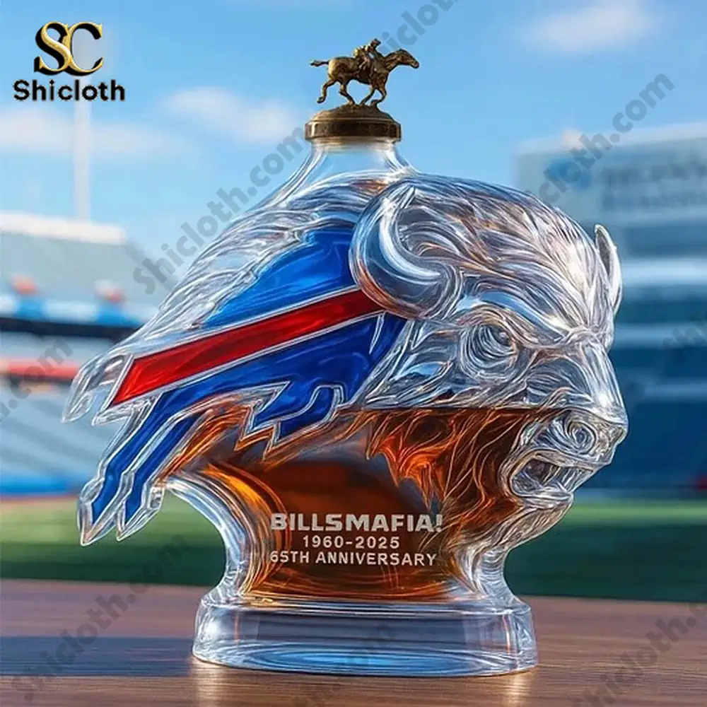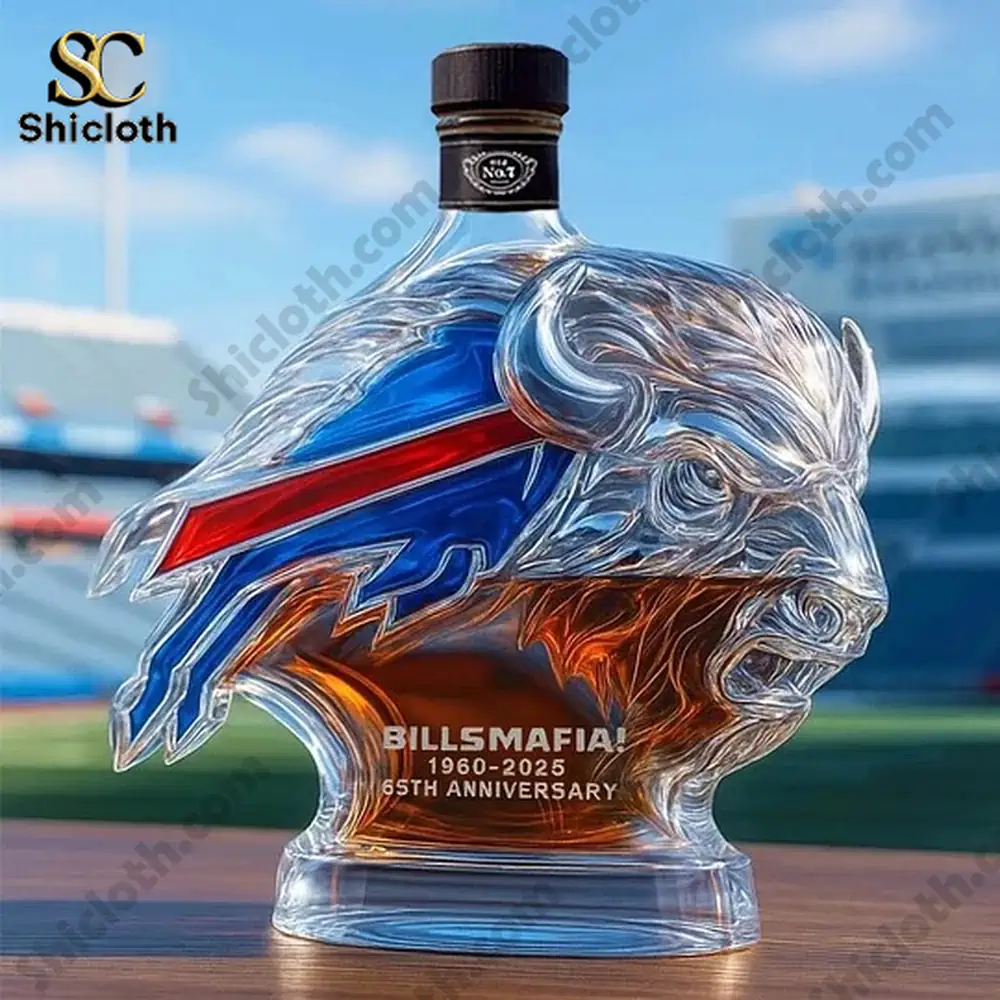 The Buffalo Bills 65th Anniversary whiskey bottle is a masterclass in custom glassware, blending sports heritage with the prestige of premium spirits. This unique piece features a meticulously sculpted buffalo head in high-quality clear glass, accented by the team’s iconic charging buffalo logo in vibrant blue and red. Whether you are a dedicated member of the Bills Mafia or a collector of fine barware, this decanter serves as a functional work of art that commemorates the franchise’s journey from 1960 to 2025.