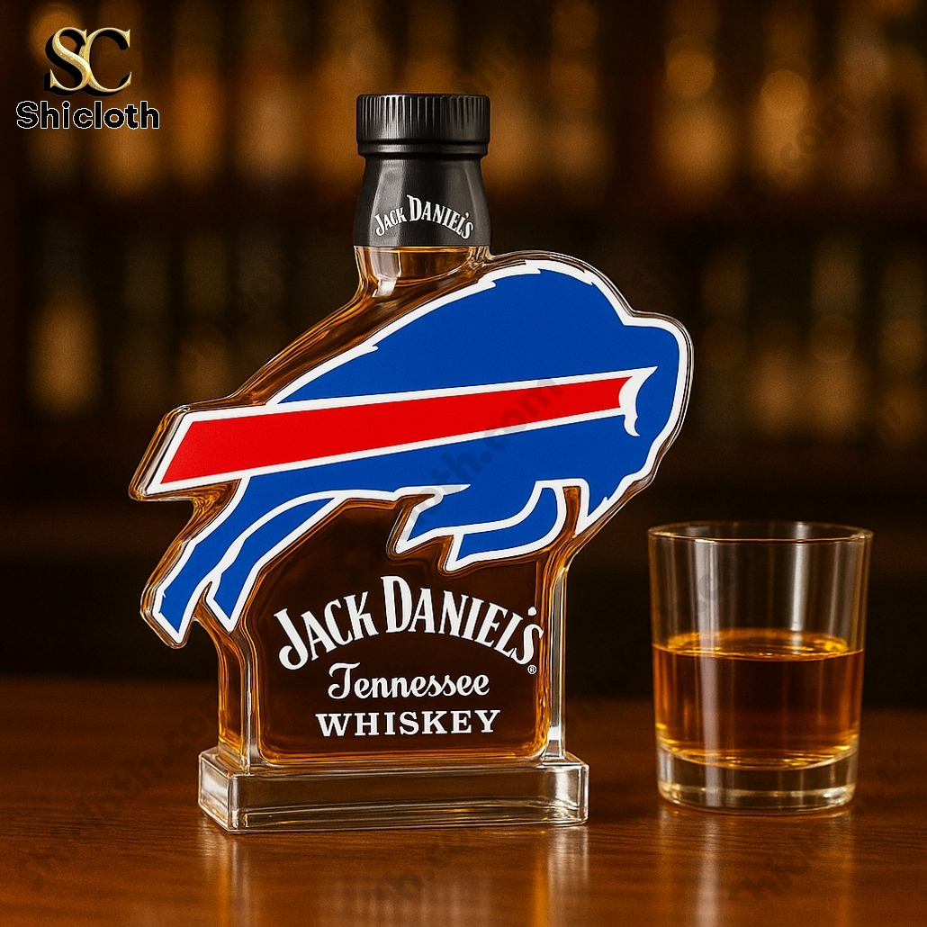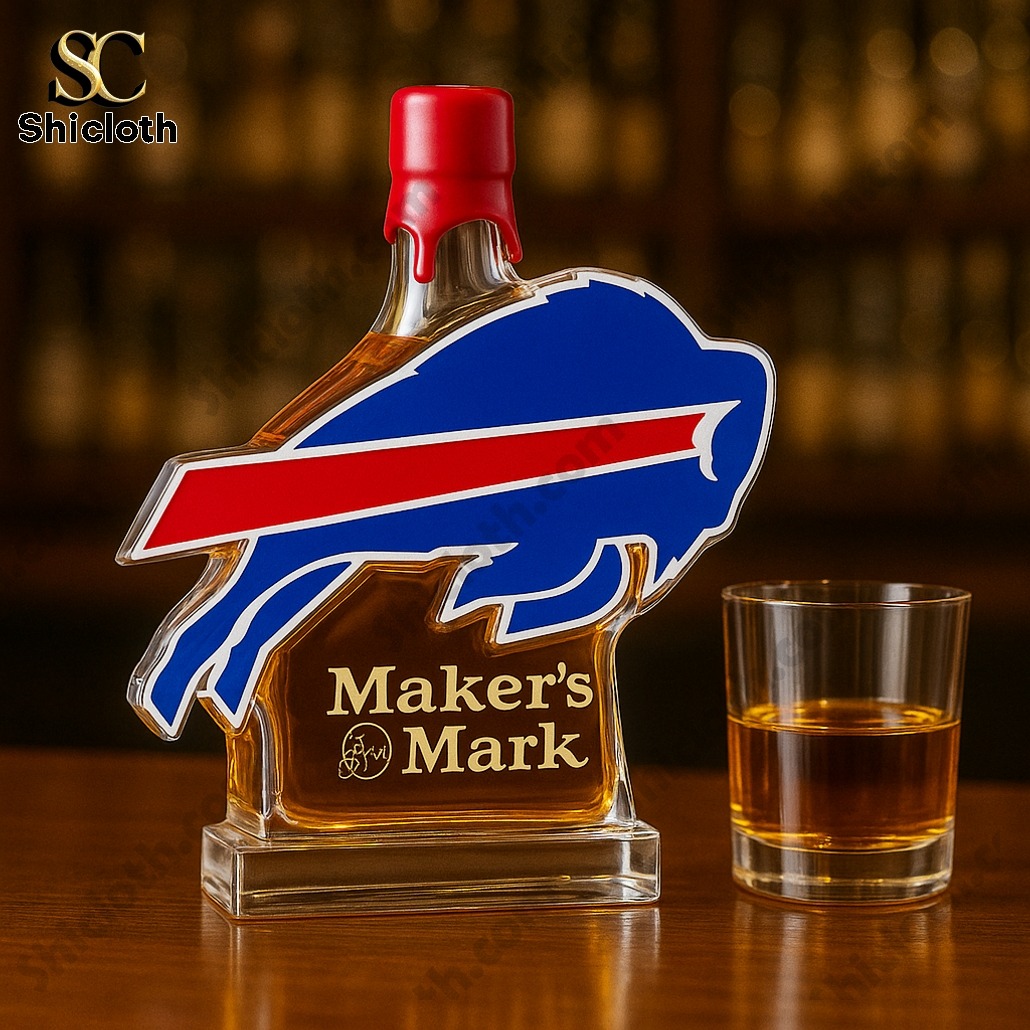 This collection offers a variety of styles to match your favorite drink. The Crown Royal version features a regal golden crown-shaped cap, while the Jack Daniel’s edition sports a classic black cap. For those who prefer a more artisanal look, the Maker’s Mark bottle comes with a distinctive red wax-dip seal, and the Blanton’s edition is topped with a miniature bronze horse and jockey. There are even options for Jameson lovers with a forest green cap and Four Roses fans with a rustic wooden topper. Each bottle is crafted from high-quality, crystal-clear glass that showcases the rich amber hue of the whiskey inside. The large Buffalo Bills logo is prominently displayed across the main body of the bottle in vibrant royal blue and red, while the specific brand label is perfectly positioned at the base.