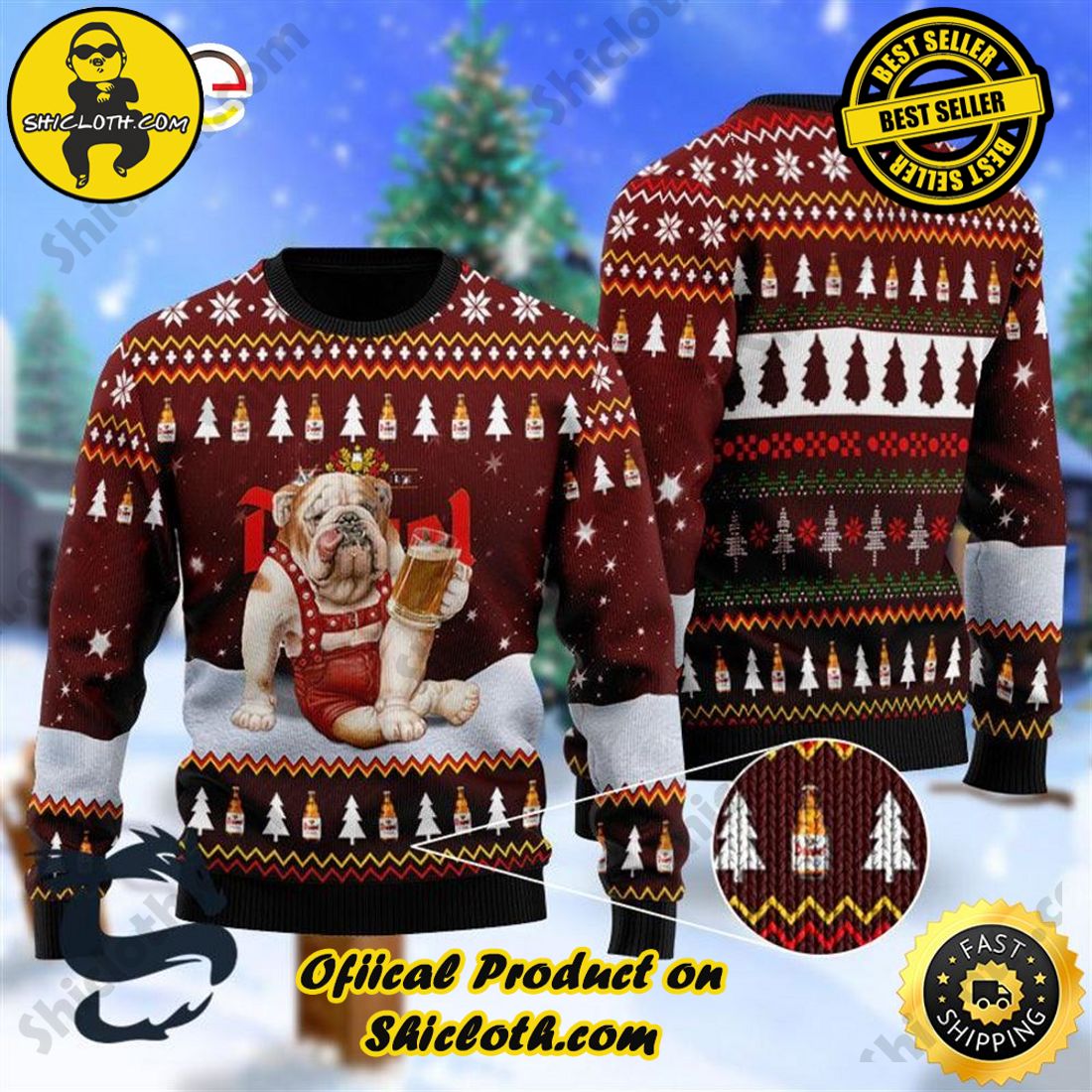Imagine the joy and laughter that will fill the air as you make your entrance wearing this eye-catching sweater. It is guaranteed to be a conversation starter, drawing smiles and inquiries from everyone around you. The playful Bulldogs on the sweater will surely invoke a sense of camaraderie, bringing people closer together through shared laughter and a love for good times. Who wouldn’t want to bond over the joy of beer and the holiday season?
