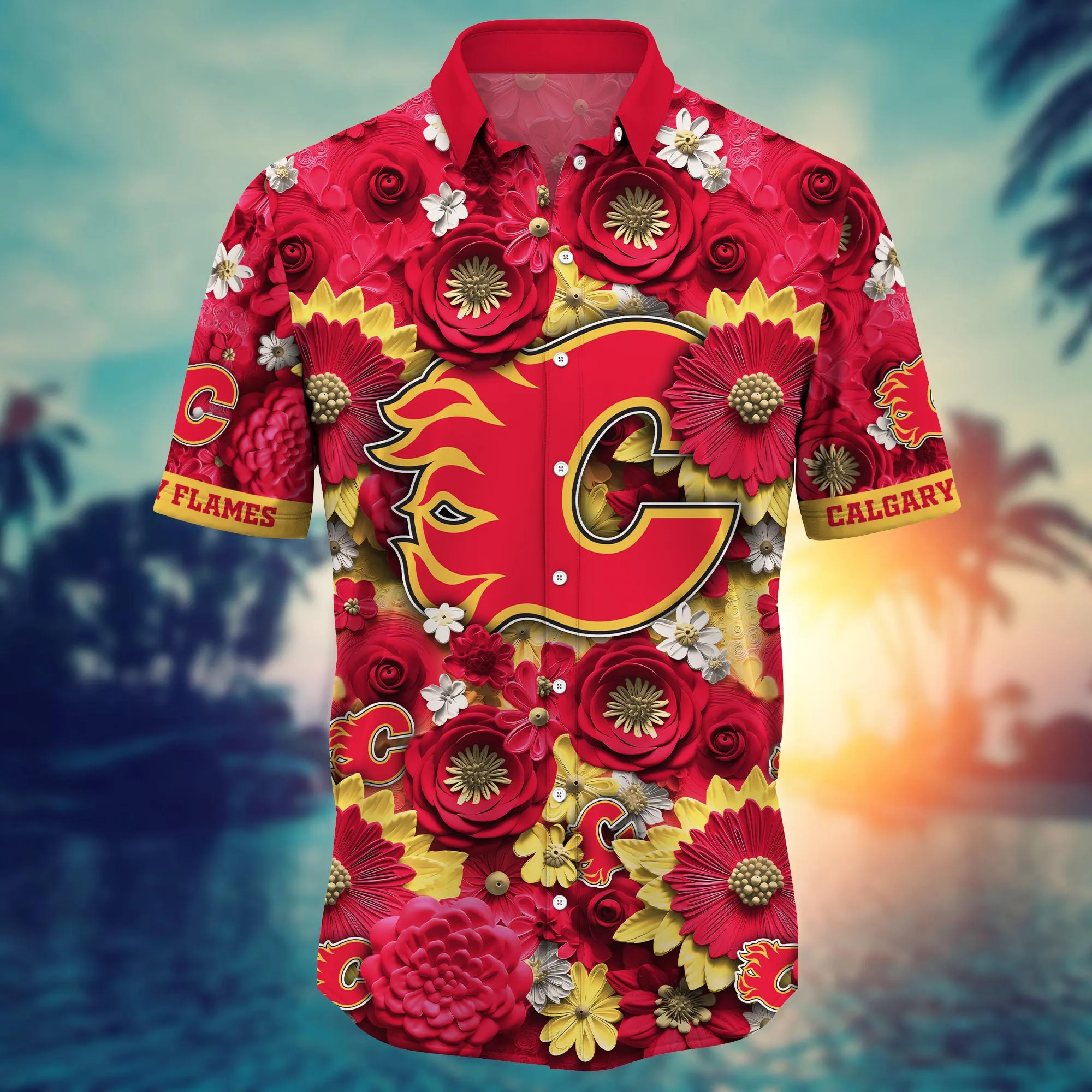 Introducing the must-have summer gear for die-hard hockey fans: the Calgary Flames NHL Hawaiian Shirt. Customize it with any team and let your fandom shine wherever you go. Crafted from premium, breathable fabric, this shirt offers both comfort and style, making it perfect for all your outings, from meeting friends to casual office days. The vibrant Hawaiian print adds a fun and tropical twist to your everyday wardrobe, while the team logo proudly displayed on the chest ensures you make a statement as a true supporter. Own this exclusive piece today and elevate your summer fashion to the next level. Picture yourself turning heads as you rock this shirt, showcasing your passion for hockey in a unique and eye-catching way.