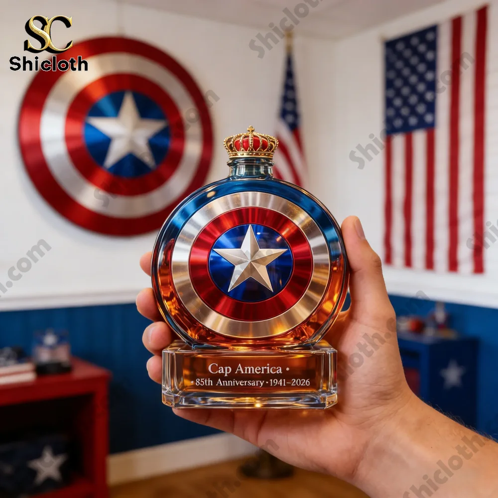 This bottle is a masterpiece of detail, showcasing a bold, metallic-finish shield on the front with a polished silver star at the center. The clear glass base is elegantly engraved with the text “Cap America • 85th Anniversary • 1941–2026,” grounding the piece with a historical touch. What truly sets this item apart is the customizable stopper system; you can choose a Crown Royal crown for a regal look, a Blanton’s horse and jockey for a classic feel, or even a Jack Daniel’s black cap to match your personal style. Every curve of the 350 ml capacity bottle is designed to catch the light, making it a vibrant focal point for any home bar or display shelf.
