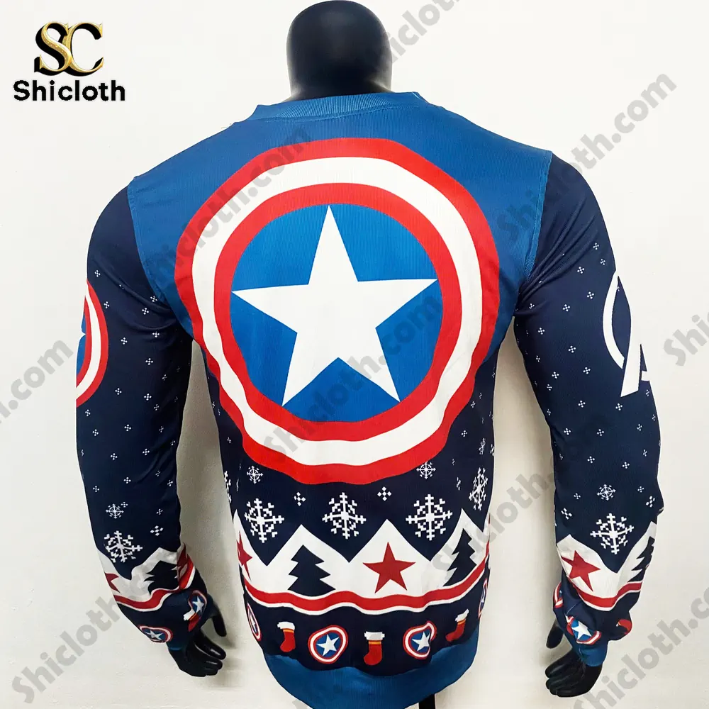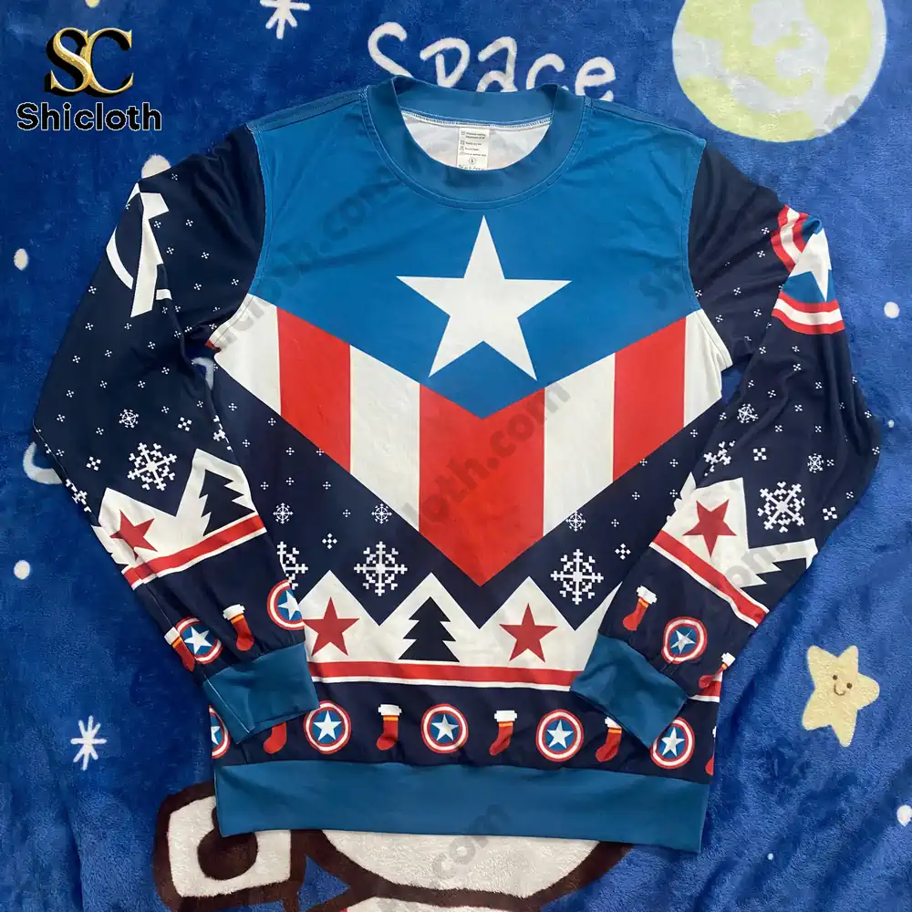 Diving headfirst into the holiday season just got a whole lot more heroic! Forget those same-old boring sweaters—it’s time to assemble your festive look with the Captain America Ugly Christmas Sweater. This isn’t just clothing; it’s a patriotic, cozy, and perfectly “ugly” declaration of your fandom, ideal for family photos by the tree or winning your office party’s ugly sweater contest. The design beautifully merges Cap’s iconic shield motif with classic holiday imagery. Featuring a vibrant blue, red, and white color palette, the front is dominated by the bold shield pattern, complete with the large white star centerpiece. The dark blue sleeves and lower section are speckled with festive patterns like snowflakes and tiny red stars, giving it that essential holiday cheer.