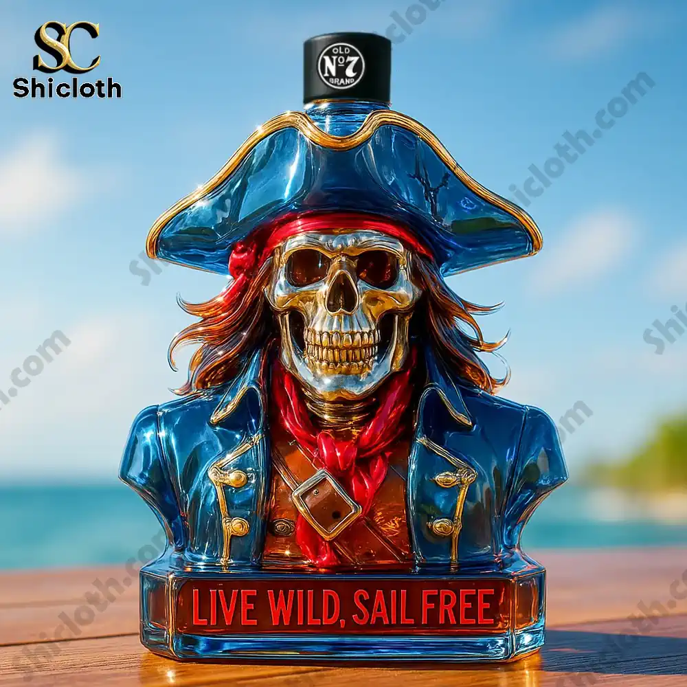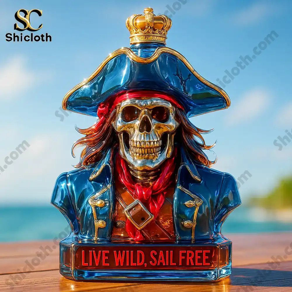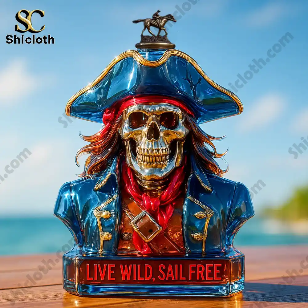 This masterpiece is constructed from Premium Glass, skillfully molded and painted to bring the swashbuckler to life. The main vessel is the pirate’s torso and base, which holds the liquid. The reflective metallic silver skull is the centerpiece, topped with flowing, glass-molded hair, a bright red bandana, and a brilliant, high-gloss royal blue tricorn captain’s hat trimmed in gold. The blue jacket also has gold trim and buttons, complementing the red cravat. The bottle’s base features the rousing motto, etched in bold red lettering: “LIVE WILD, SAIL FREE.” The pouring spout is cleverly integrated into the top of the head/hat, sealed by your choice of famous bottle stopper, like the deep green cap (Jameson) or the signature red cap (Marker’s Mark), making the entire piece feel incredibly detailed and custom.