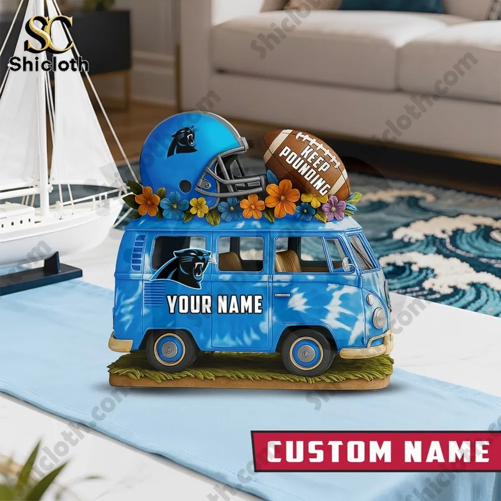 This custom Carolina Panthers acrylic plaque is the ultimate fan tribute, blending a classic vintage aesthetic with bold team pride. Featuring a vibrant tie-dye blue van topped with a football helmet and a “Keep Pounding” football, this 1.5cm thick premium piece offers a high-end, substantial feel that elevates any office desk or home bookshelf.