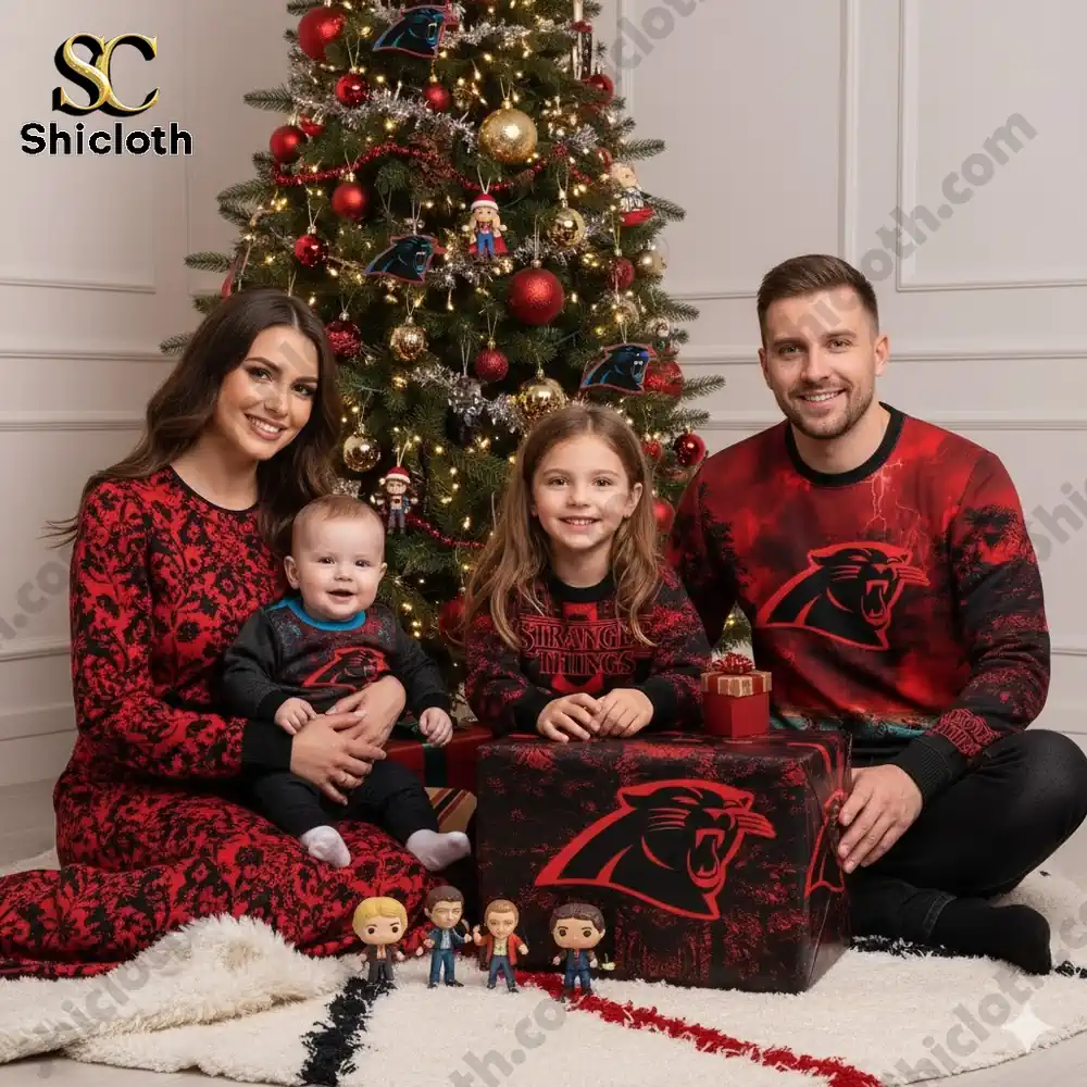 Get ready to flip your holiday style upside down. This Carolina Panthers x Stranger Things Ugly Sweater is the ultimate mashup for fans of football and hit TV shows. It’s the perfect, unique piece for your wardrobe, whether you’re at a game, a holiday party, or just hanging out. This sweater is available in sizes for the whole family, making it a fantastic matching outfit for your holiday photos.