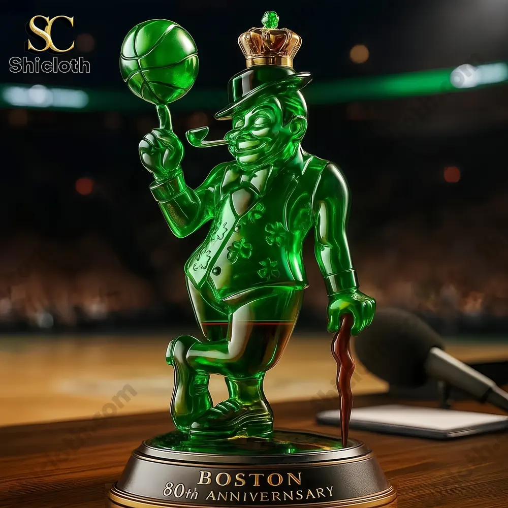 Crafted from Premium Glass, this bottle captures every detail of the iconic figure. It features the figure balancing a textured green basketball on its index finger, while holding a brown, carved cane in the other hand. He’s smiling widely, sporting a pipe, a top hat, and a waistcoat covered in cloverleaf motifs, emphasizing the lucky theme. The main glass body is a rich, vibrant, translucent green. The entire figure stands on a sturdy, detailed bronze-colored base inscribed with “BOSTON 80th ANNIVERSARY” in a clean, legible font, permanently marking this significant milestone. The pouring spout is cleverly placed on top of the hat, ready for your chosen cap to be securely fastened.