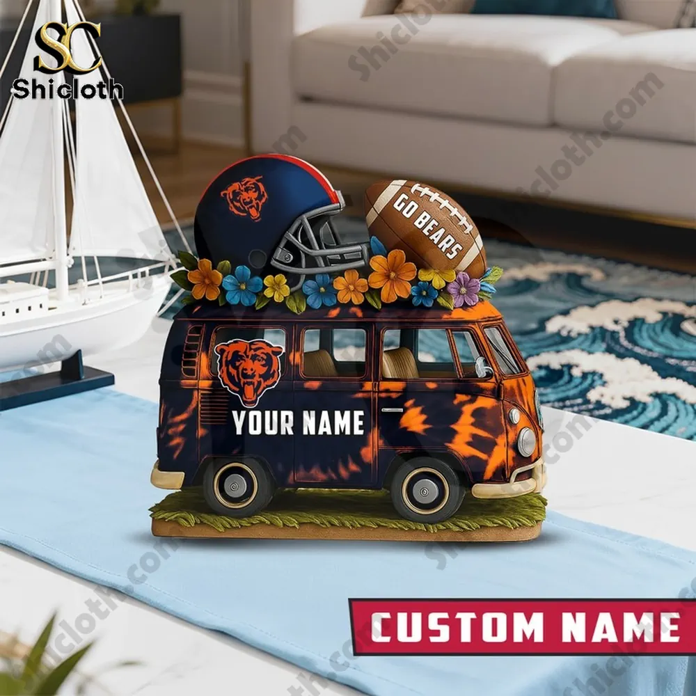 This custom Chicago Bears acrylic plaque is a standout piece of fan gear that combines vintage vibes with modern craftsmanship. Designed as a classic van bus, it serves as a personalized tribute to the team, featuring vibrant navy and orange tie-dye patterns and high-quality 3D-style graphics. It is a solid, premium decorative item that fits perfectly on a desk, bookshelf, or bedside table for any dedicated supporter.