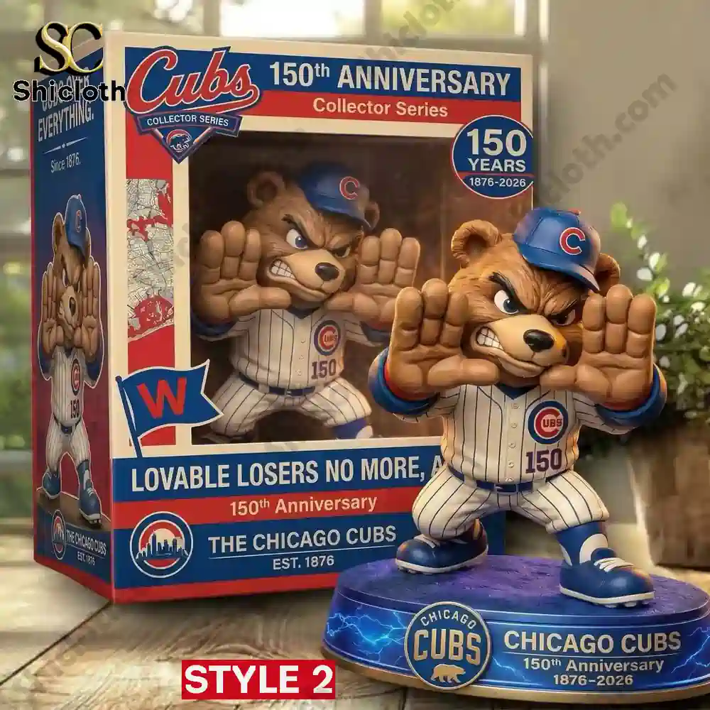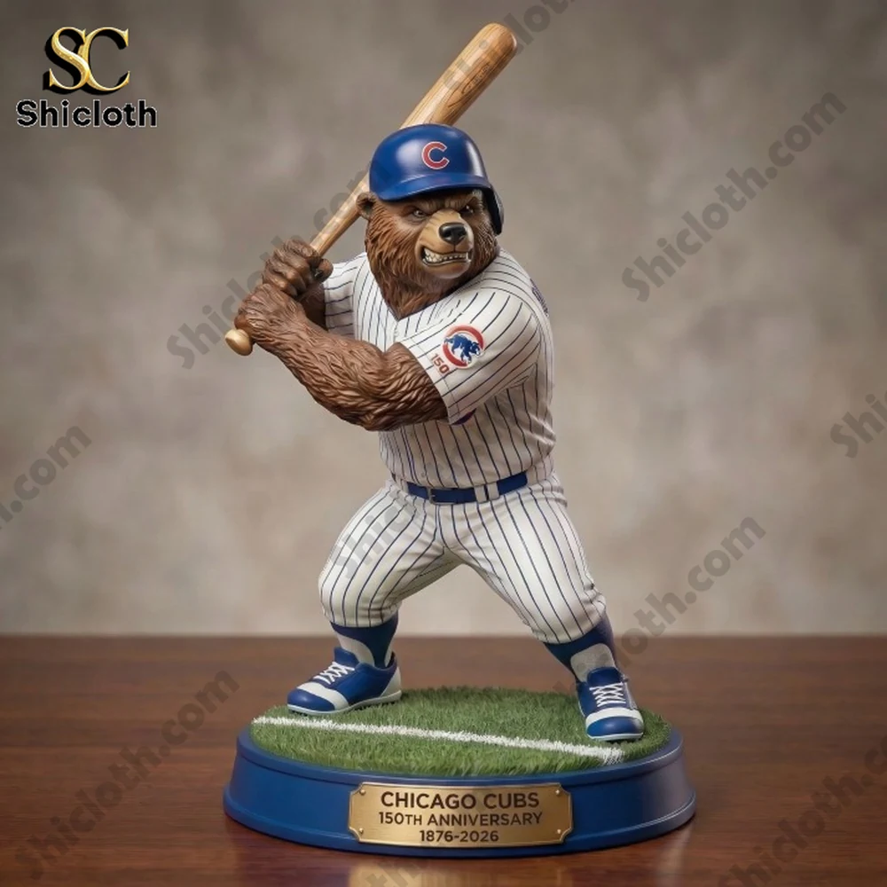 The collection features two unique designs to suit your personal taste. Style 1 showcases a realistic, muscular bear in a professional batting stance, featuring a textured fur finish and a classic pinstripe jersey with a special 150th-anniversary patch on the sleeve. It stands on a lush green grass base with a white foul line and a gold-tone nameplate marking the 1876-2026 milestone. For those who love a more modern, expressive look, Style 2 features the mascot in a dynamic “power pose” with oversized paws and a defiant expression. This version sits on a glowing blue lightning base and comes in a premium window display box adorned with a vintage Chicago map and the “Lovable Losers No More” slogan. Both styles are crafted from durable high-grade resin, ensuring a weighty, premium feel that resists fading over time.