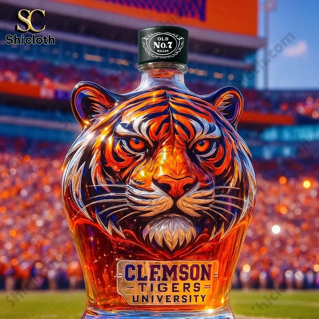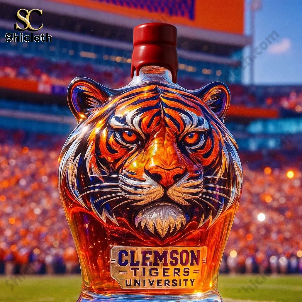 This exceptional piece is crafted from high-quality, thick glass, giving it a substantial and premium feel. The bottle itself is masterfully shaped into the head of a fierce tiger, the revered mascot of Clemson University. The artwork is breathtakingly detailed, with vibrant shades of orange, bold black stripes, and striking white accents that create a near-lifelike appearance. The tiger’s intense, glowing orange eyes seem to stare right through you, capturing the powerful spirit of the team. At the base of the bottle, a classic blue and white label proudly displays the words “CLEMSON TIGERS UNIVERSITY,” making it an unmistakable symbol of your allegiance.