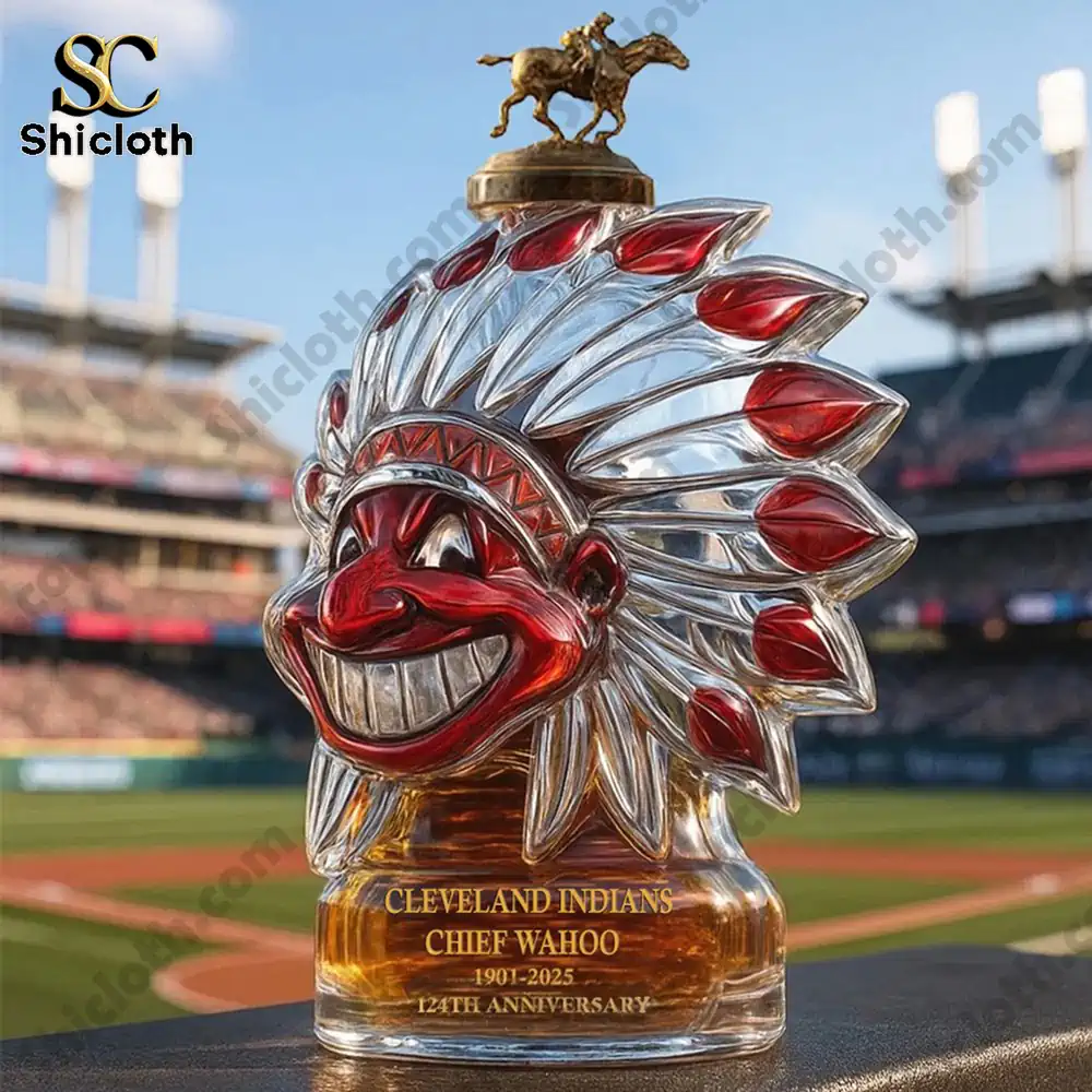 The base features gold text detailing this historic milestone: “CLEVELAND INDIANS”, “CHIEF WAHOO”, “1901-2025”, and “124TH ANNIVERSARY”. This isn’t just for show; it’s a high-quality 350ml decanter (about 20*10cm) perfect for your favorite whiskey, wine, or beer. Just a heads-up, this collector’s piece comes empty, so you can fill it with your own preferred spirit.