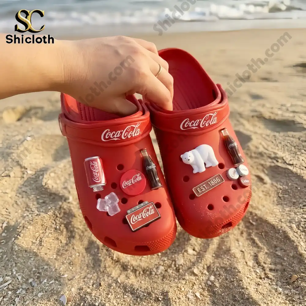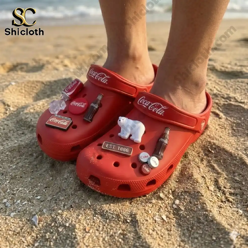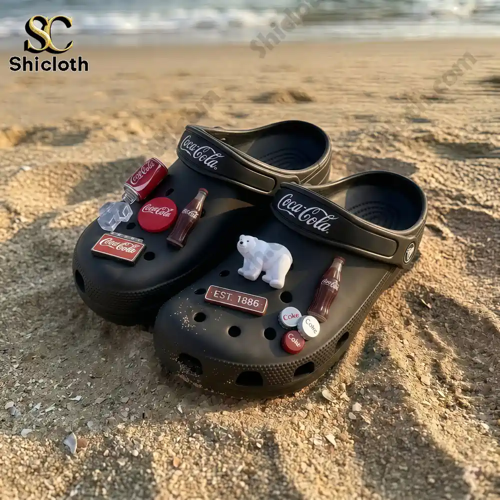 The Coca-Cola 140th Anniversary Commemorative Clogs represent a sophisticated fusion of heritage and modern comfort, celebrating nearly a century and a half of refreshment. Available in both a classic deep black and a vibrant “Coke Red,” these clogs feature a meticulously curated selection of 3D Jibbitz charms that tell the brand’s story. From the iconic white polar bear and vintage glass bottles to miniature soda cans with realistic “ice cubes” and “EST. 1886” plaques, every detail is strategically placed to evoke nostalgia. The dye-sublimation printing ensures that the crisp white Coca-Cola script on the heel strap remains sharp and resistant to fading, maintaining a premium aesthetic even after heavy use at the beach or in the city.