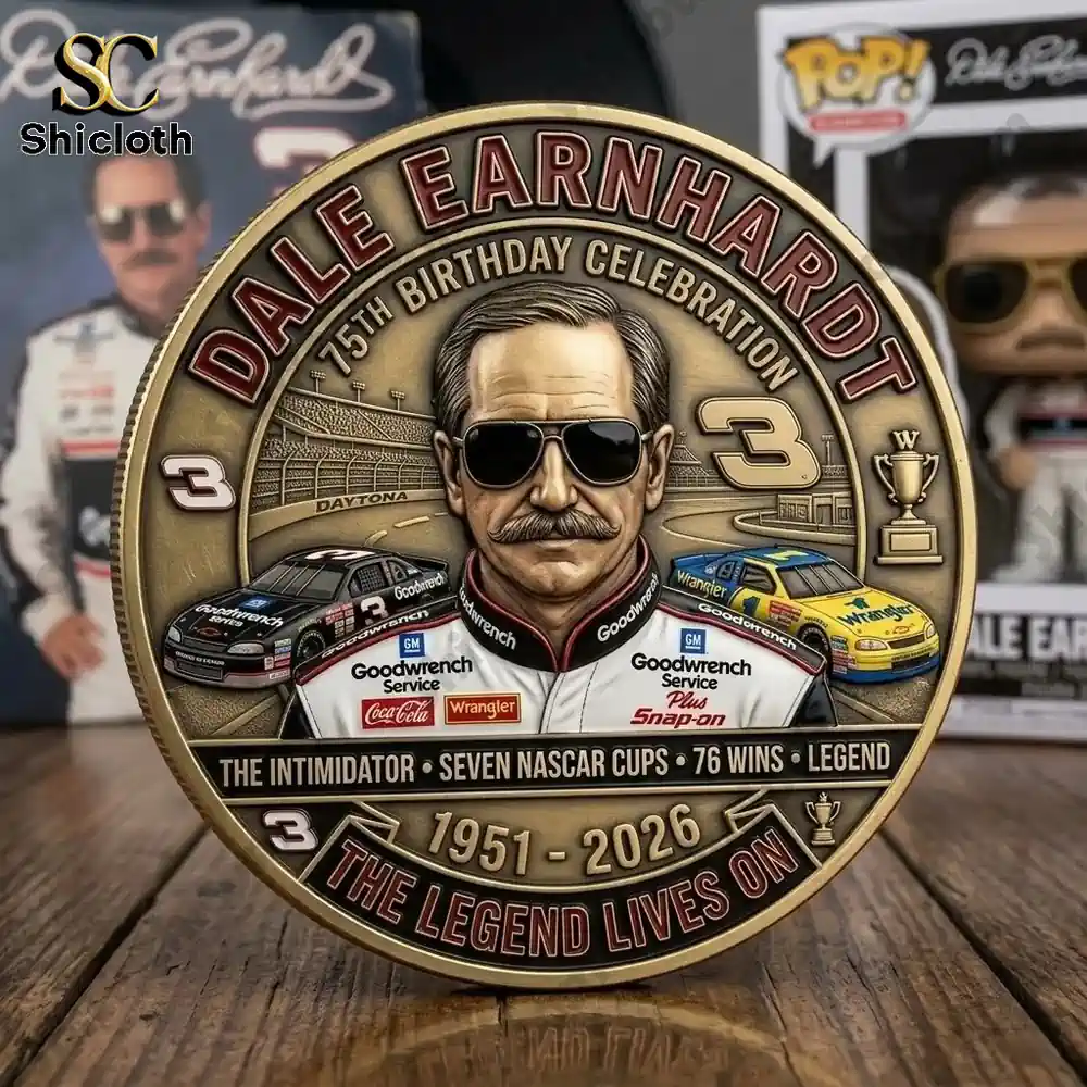 Honoring the 75th birth anniversary of a NASCAR icon, the Dale Earnhardt 75th Birthday Commemorative Coin is a must-have for any racing enthusiast looking for a high-quality keepsake. This double-sided coin features a detailed 3D high-relief engraving of “The Intimidator” in his signature sunglasses on the front, flanked by his legendary No. 3 cars and the dates 1951-2026. The reverse side proudly displays seven championship trophies, representing his Winston Cup titles, alongside his career-defining 76 wins. Crafted from a premium zinc alloy with an antique bronze finish, this coin offers a heavy, substantial feel in the hand, ensuring it stands the test of time as a centerpiece of your collection.