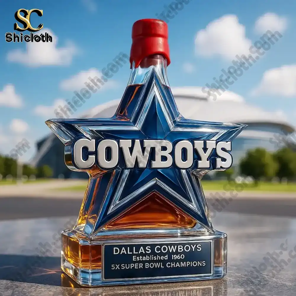 The star sits on a thick, heavy glass base that makes it feel like a real trophy. On the front of this base is a plaque that honors the team’s legacy, reading “DALLAS COWBOYS”, “Established 1960”, and “5X SUPER BOWL CHAMPIONS“. This is a functional 350ml (20*10cm) bottle, perfect for storing your favorite whiskey, wine, or any other beverage. It comes empty, so you can fill it with your spirit of choice.