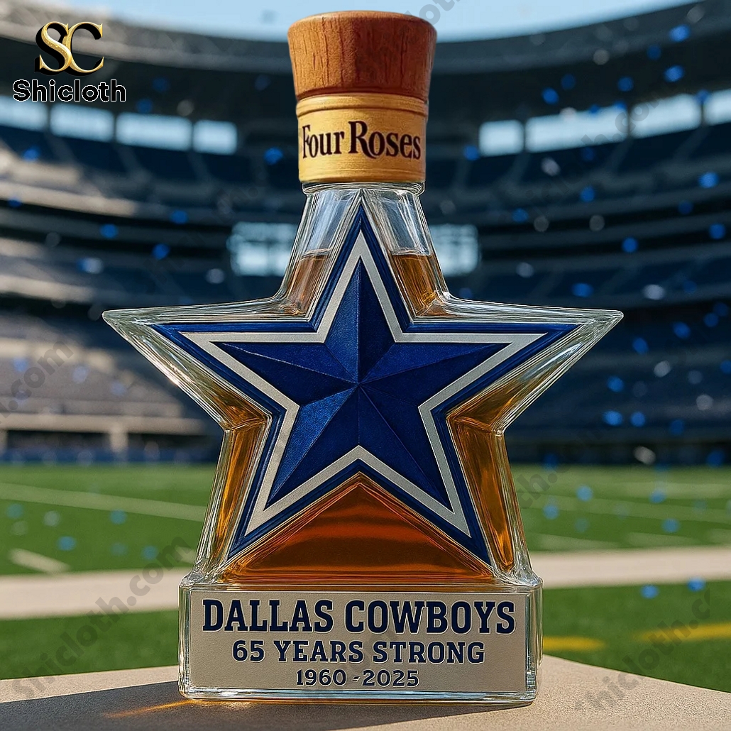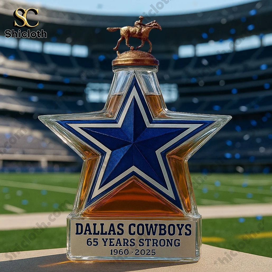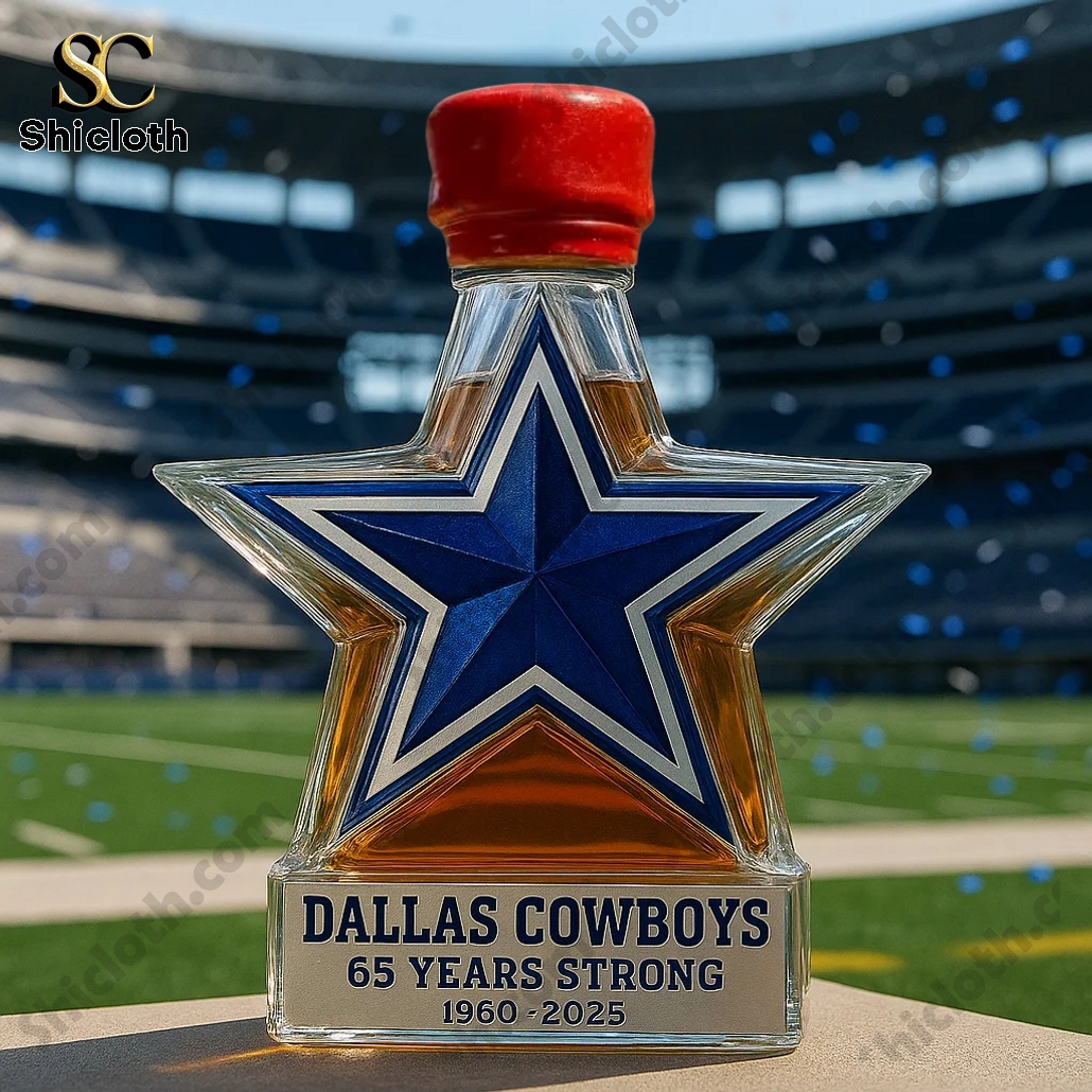 The Dallas Cowboys 65 Years Strong Whiskey Bottle comes in a unique, star-shaped design that is a tribute to the legendary football team. The bottle is primarily a deep blue and white, reflecting the team’s iconic colors, with intricate detailing around the edges. At the base of the bottle, there’s a silver plaque that reads “DALLAS COWBOYS 65 YEARS STRONG 1960-2025”, highlighting the milestone. The bottle’s shape resembles the team’s star logo, and it features different styles of caps to enhance its collectible appeal.