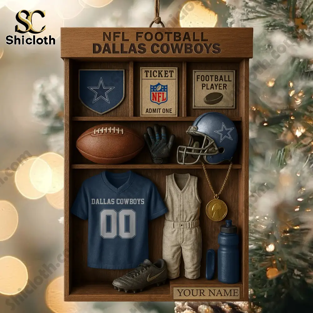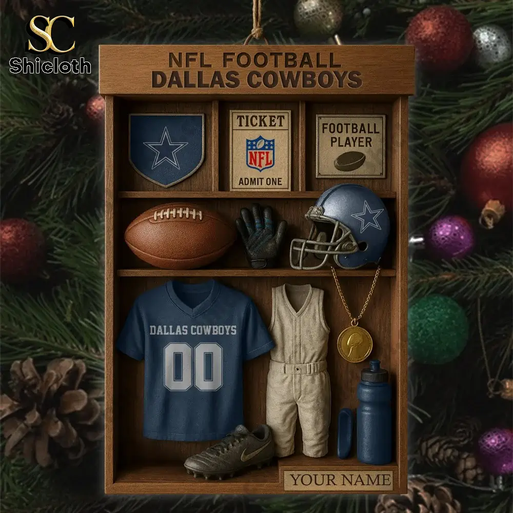 The ornament is meticulously designed to resemble a classic wooden locker shelf, showcasing several miniature pieces of Dallas Cowboys gear. At the top, the words “NFL FOOTBALL DALLAS COWBOYS” are embossed onto the wood-look header. Inside the cubbies, you’ll find tiny, detailed elements: a blue shield with the iconic star logo, an “ADMIT ONE” NFL ticket stub, and a “FOOTBALL PLAYER” square. Below this, the shelf holds a miniature brown football, a black receiver glove, and a blue helmet featuring the Cowboys star. The bottom shelf displays a blue Cowboys jersey customized with “DALLAS COWBOYS 00” (ready for your personalization), a beige uniform, a gold medal on a necklace, a black cleat, and a blue water bottle. Even the “YOUR NAME” plate at the bottom is ready for that personal touch. Every detail, from the color-rich print to the arrangement, is designed to evoke nostalgia and team pride.