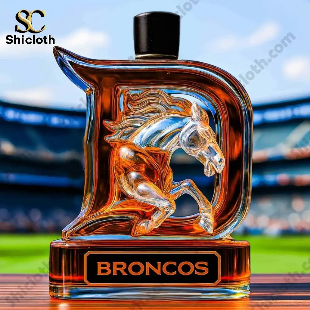 This bottle is a masterwork of clear and colored glass, shaped precisely like the vintage oversized letter ‘D’, which proudly stands for Denver. Contained within the ‘D’ is a three-dimensional, sculpted clear glass horse, captured mid-stride, which instantly comes to life when the bottle is filled with a rich, amber-colored whiskey. The surrounding ‘D’ shape of the glass itself is contoured and partially colored to reflect the team’s traditional orange and blue, emphasizing the horse’s white/clear form. The base is a solid, rectangular block that features the single, bold text “BRONCOS” in gold on a clear background, firmly anchoring the piece. The neck of the decanter is ready for customization, as shown with either a classic black screw cap, a festive red wax seal look, or a majestic golden crown stopper, adding versatility and flair.