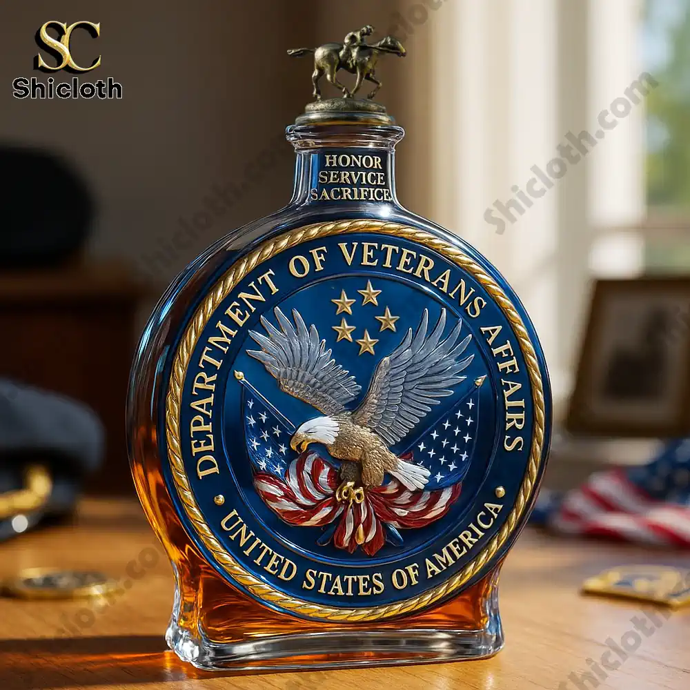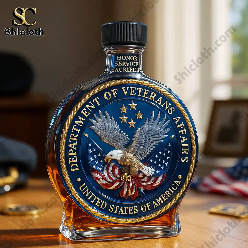 Let’s talk details! The bottle itself is crafted from Premium Glass, showcasing the rich, amber hue of a fine spirit (though remember, it arrives Empty and does not contain any liquid). The centerpiece is a magnificent, textured medallion seal. The deep cobalt blue background is encircled by a golden rope-like border and features the words “Department of Veterans Affairs” and “UNITED STATES OF AMERICA” in bold, gold lettering. At the core, a majestic silver and gold eagle soars over a tri-colored banner, flanked by four gold stars. Just above the main body, the neck is embossed with the profound motto: “Honor, Service, Sacrifice.” This level of detail elevates the bottle beyond mere decor, establishing it as a respectful and high-quality tribute.